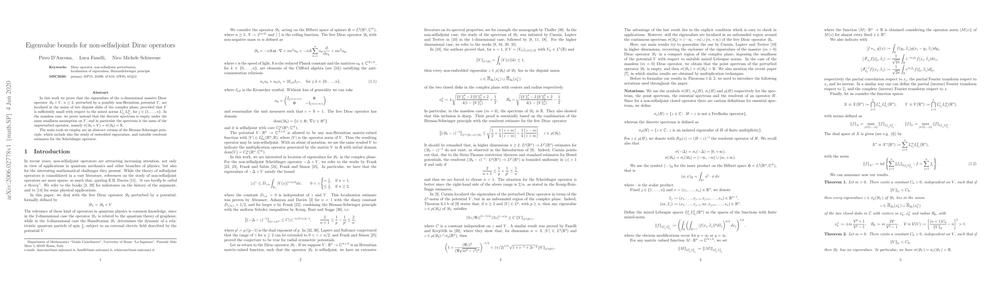 Researchers prove that eigenvalues of a non-selfadjoint Dirac operator with a small perturbation are localized within two disjoint disks in the complex plane, while massless cases have empty discrete spectrum.