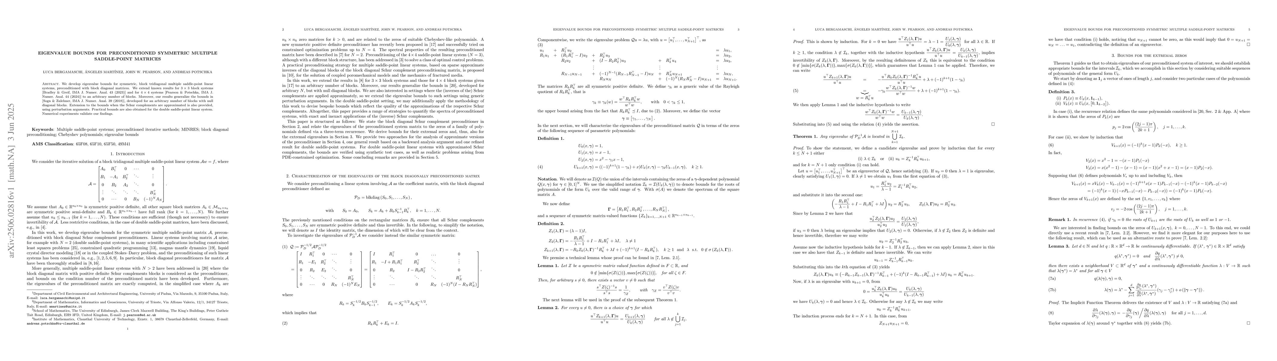 Researchers develop eigenvalue bounds for symmetric multiple saddle-point matrices pre-conditioned with block diagonal matrices, extending previous results to arbitrary numbers of blocks.