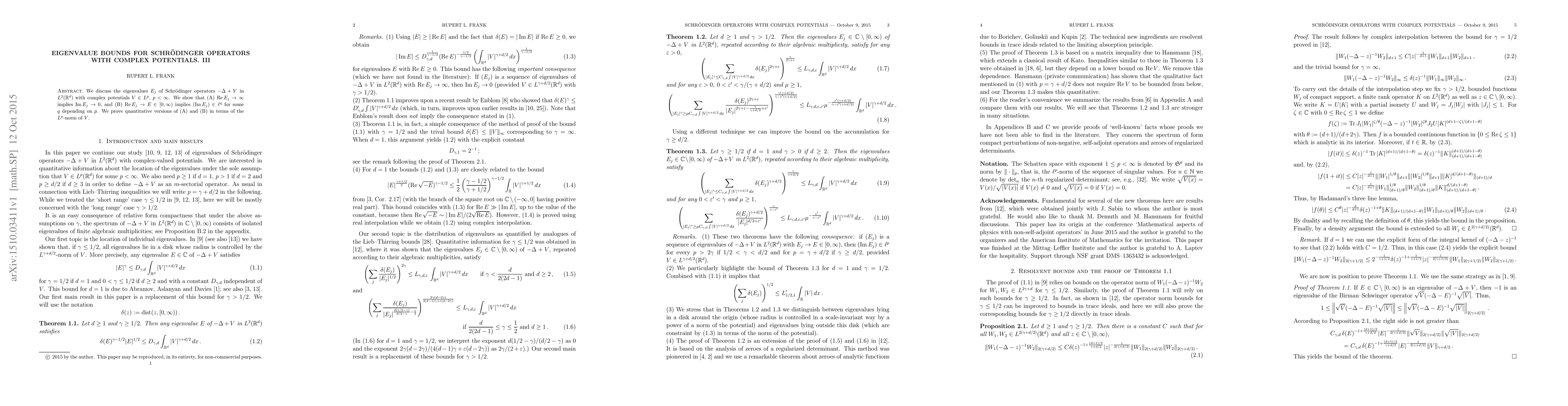 We discuss the eigenvalues $E_j$ of Schr\"odinger operators $-\Delta+V$ in $L^2(\mathbb R^d)$ with complex potentials $V\in L^p$, $p<\infty$. We show that (A) $\mathrm{Re} E_j\to\infty$ implies $\mathrm{Im} E_j\to 0$, and (B) $\mathrm{Re} E_j\to E\in [0,\infty)$ implies $(\mathrm{Im} E_j)\in\ell^q$ for some $q$ depending on $p$. We prove quantitative versions of (A) and (B) in terms of the $L^p$-norm of $V$.