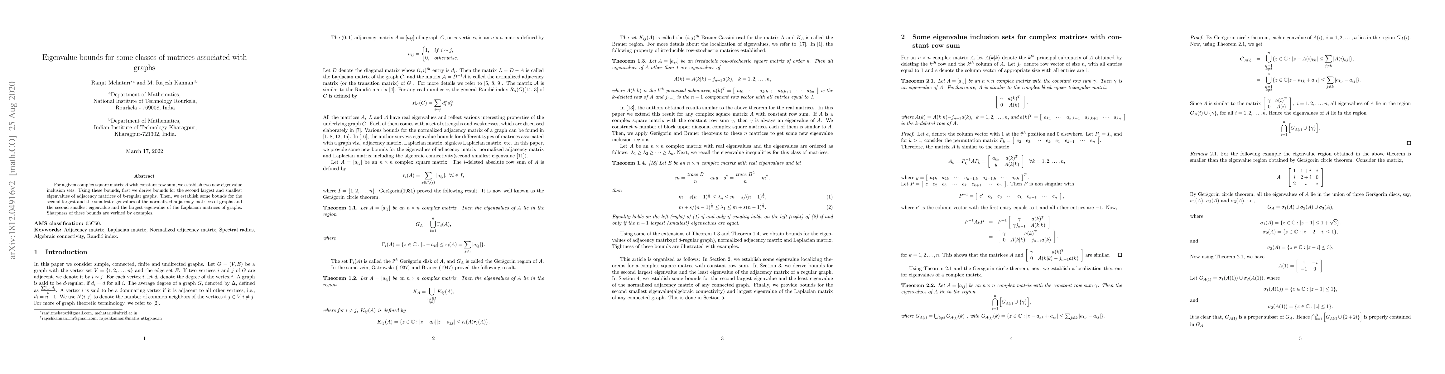 For a given complex square matrix $A$ with constant row sum, we establish two new eigenvalue inclusion sets. Using these bounds, first we derive bounds for the second largest and smallest eigenvalues of adjacency matrices of $k$-regular graphs. Then, we establish some bounds for the second largest and the smallest eigenvalues of the normalized adjacency matrices of graphs and the second smallest eigenvalue and the largest eigenvalue of the Laplacian matrices of graphs. Sharpness of these bounds are verified by examples.