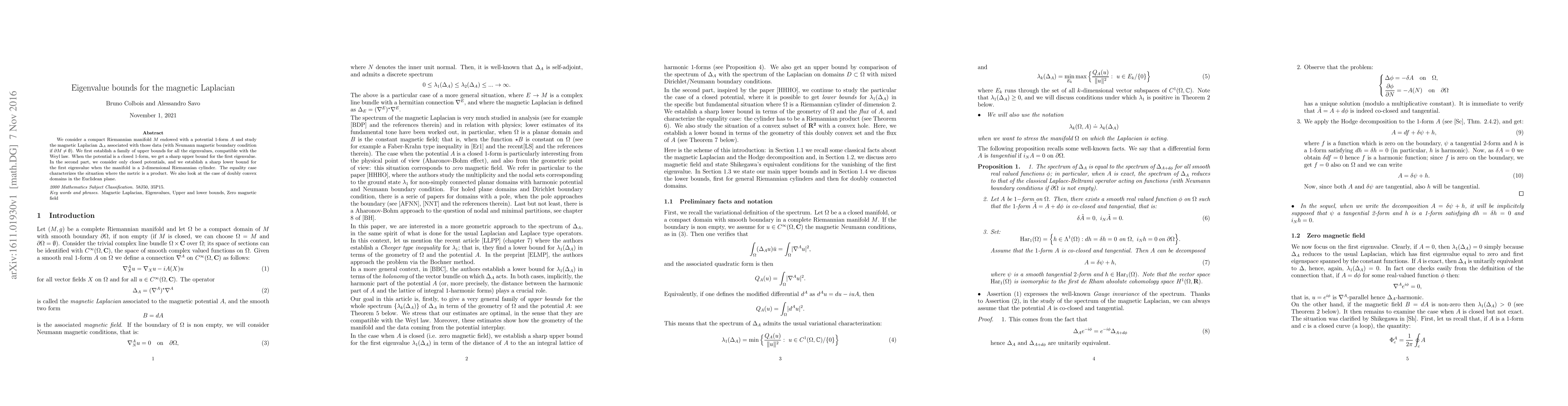 This paper establishes eigenvalue bounds for the magnetic Laplacian on a compact Riemannian manifold with a potential 1-form, focusing on both upper and lower bounds, particularly for the first eigenvalue. Sharp bounds are derived for 2-dimensional Riemannian cylinders and doubly convex domains in the Euclidean plane.