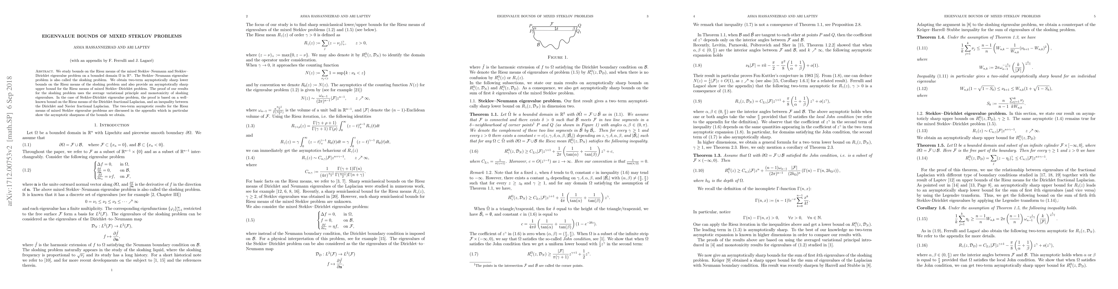 This paper investigates eigenvalue bounds for mixed Steklov problems, deriving two-term asymptotically sharp lower bounds for the Riesz means of the Steklov-Neumann (sloshing) problem and an asymptotically sharp upper bound for the mixed Steklov-Dirichlet problem, using variational principles and inequalities between fractional Laplacians.