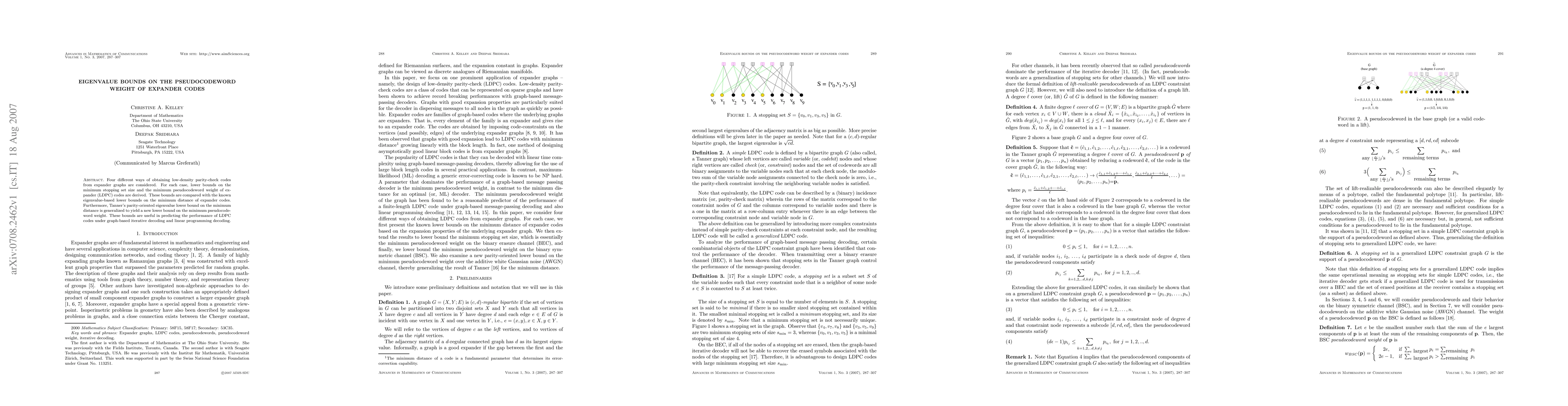This paper explores four methods for generating low-density parity-check codes from expander graphs, deriving lower bounds on their minimum stopping set size and pseudocodeword weight. It also generalizes Tanner's eigenvalue-based minimum distance bound to predict LDPC code performance under iterative and linear programming decoding.
