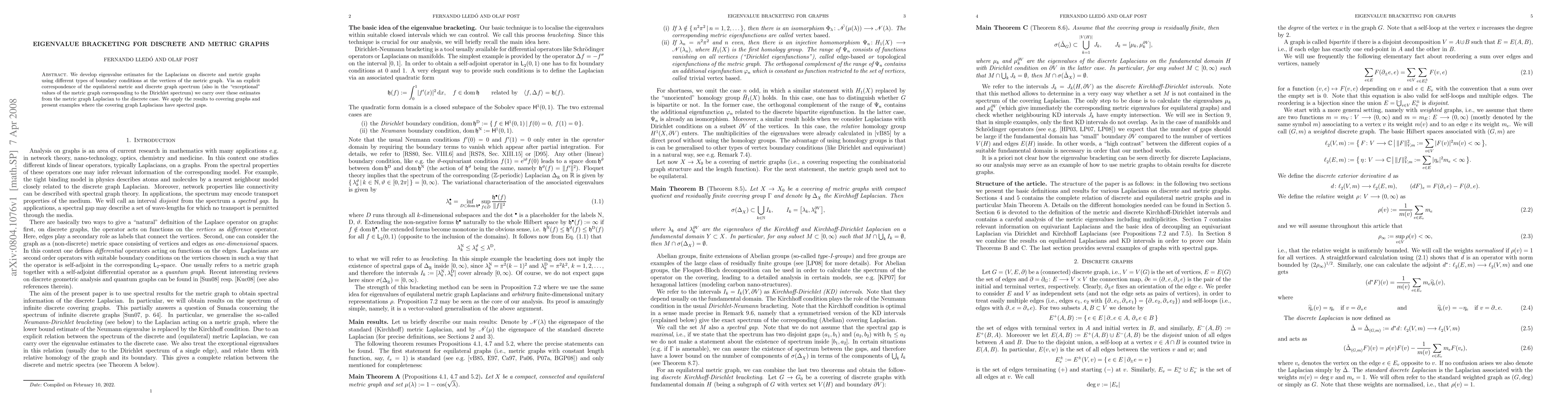 Summary: The paper develops eigenvalue estimates for Laplacians on both discrete and metric graphs under various boundary conditions, establishing a correspondence between their spectra and applying the estimates to covering graphs, which exhibit spectral gaps.