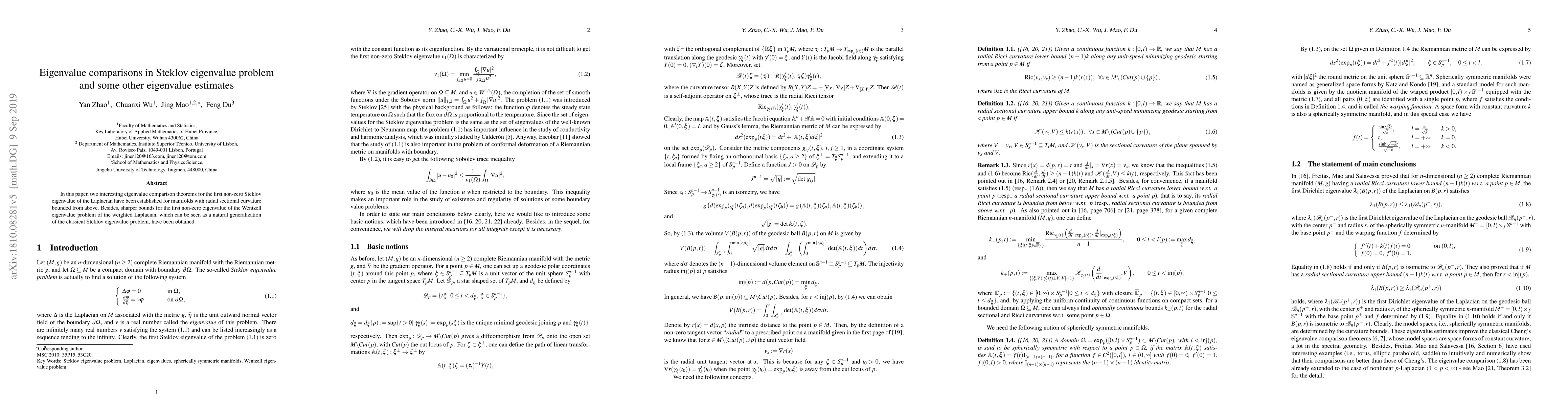 In this paper, two interesting eigenvalue comparison theorems for the first non-zero Steklov eigenvalue of the Laplacian have been established for manifolds with radial sectional curvature bounded from above. Besides, sharper bounds for the first non-zero eigenvalue of the Wentzell eigenvalue problem of the weighted Laplacian, which can be seen as a natural generalization of the classical Steklov eigenvalue problem, have been obtained.