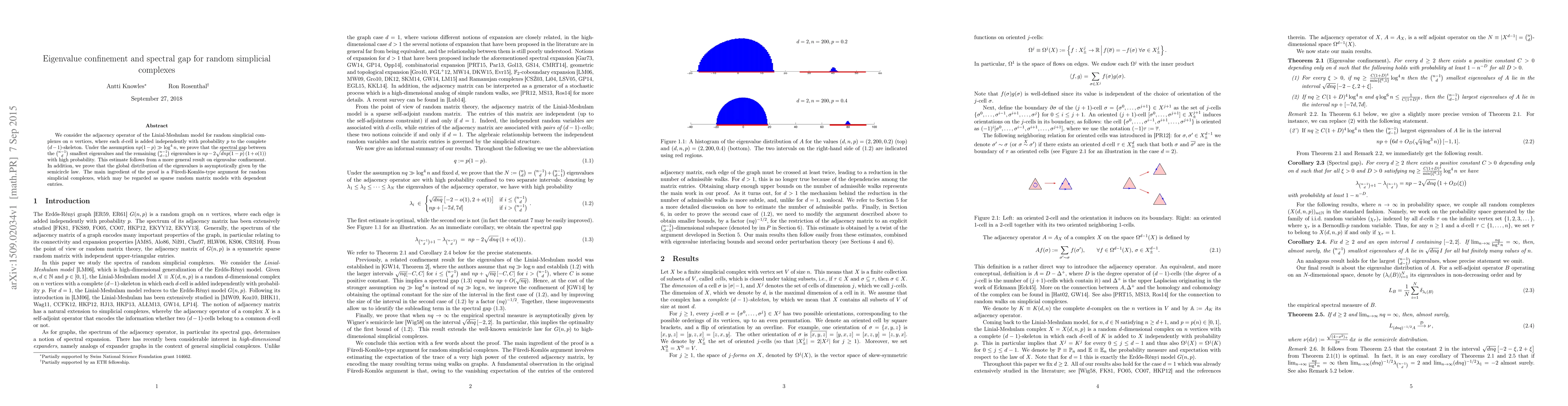 This paper investigates the spectral properties of random simplicial complexes, proving that the spectral gap is asymptotically $np - 2\sqrt{dnp(1-p)} \, (1 + o(1))$ under certain conditions. The study also demonstrates eigenvalue confinement and shows that the global eigenvalue distribution follows a semicircle law.