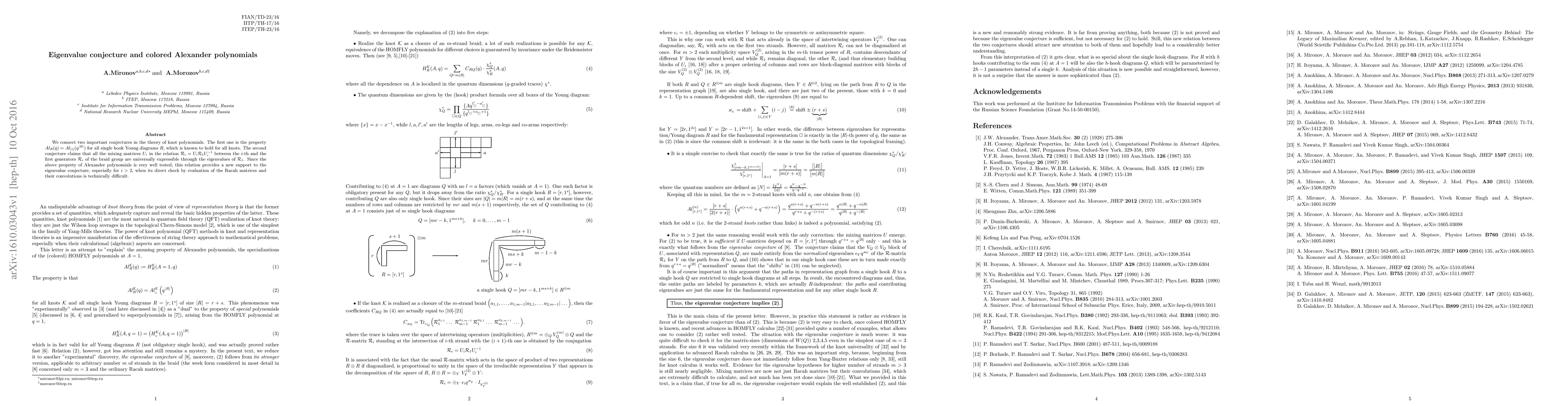 We connect two important conjectures in the theory of knot polynomials. The first one is the property Al_R(q) = Al_{[1]}(q^{|R|}) for all single hook Young diagrams R, which is known to hold for all knots. The second conjecture claims that all the mixing matrices U_{i} in the relation {\cal R}_i = U_i{\cal R}_1U_i^{-1} between the i-th and the first generators {\cal R}_i of the braid group are universally expressible through the eigenvalues of {\cal R}_1. Since the above property of Alexander polynomials is very well tested, this relation provides a new support to the eigenvalue conjecture, especially for i>2, when its direct check by evaluation of the Racah matrices and their convolutions is technically difficult.