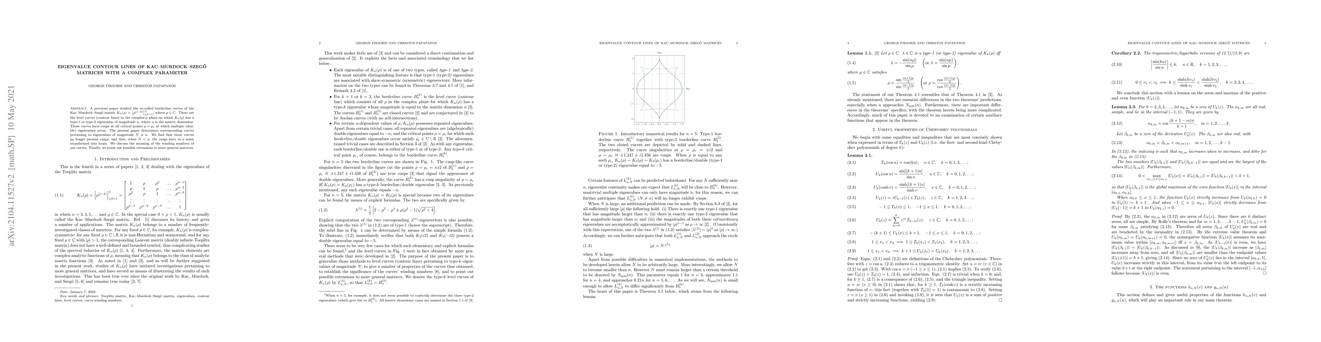 This paper investigates the eigenvalue contour lines of Kac-Murdock-Szegő matrices with a complex parameter, determining the curves for eigenvalues of magnitude different from the matrix dimension. Unlike previous findings, these curves lack cusps and exhibit loops for smaller eigenvalues.