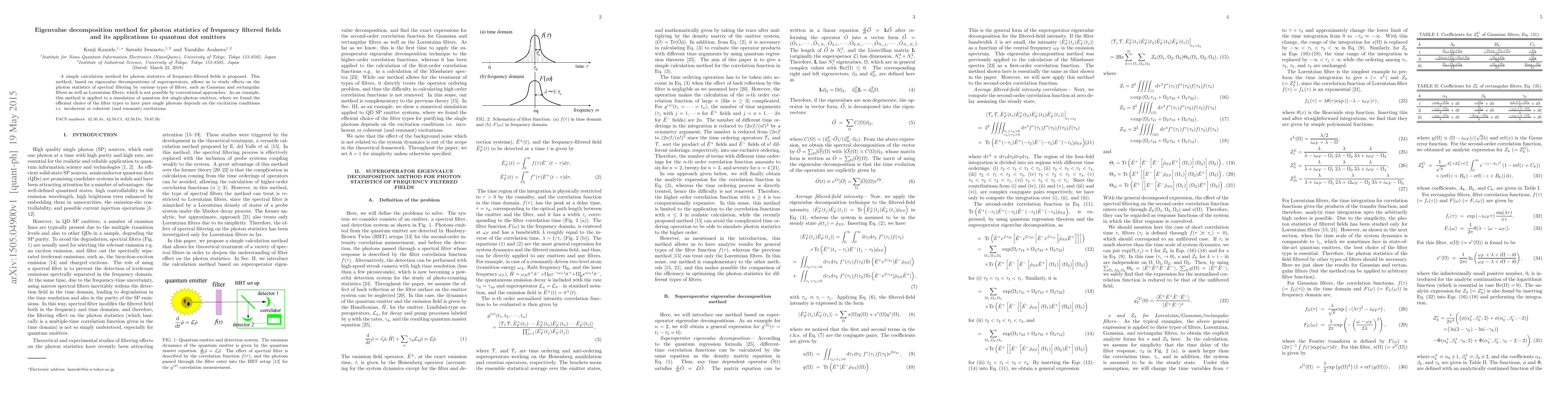 A simple calculation method for photon statistics of frequency-filtered fields is proposed. This method, based on eigenvalue decompositions of superoperators, allows us to study effects on the photon statistics of spectral filtering by various types of filters, such as Gaussian and rectangular filters as well as Lorentzian filters, which is not possible by conventional approaches. As an example, this method is applied to a simulation of quantum dot single-photon emitters, where we found the efficient choice of the filter types to have pure single photons depends on the excitation conditions i.e. incoherent or coherent (and resonant) excitations.