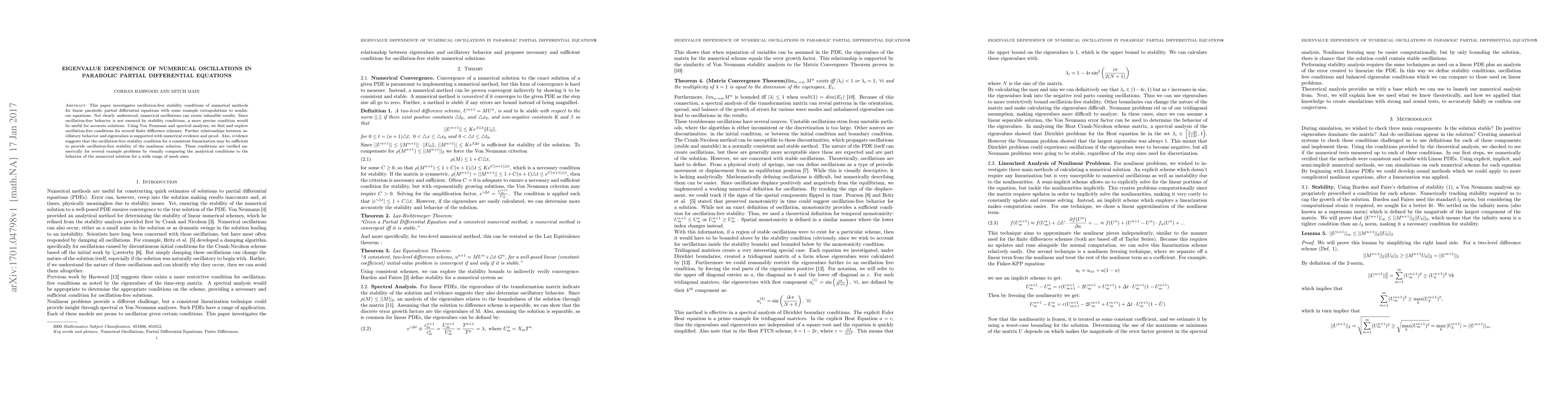 This paper investigates oscillation-free stability conditions of numerical methods for linear parabolic partial differential equations with some example extrapolations to nonlinear equations. Not clearly understood, numerical oscillations can create infeasible results. Since oscillation-free behavior is not ensured by stability conditions, a more precise condition would be useful for accurate solutions. Using Von Neumann and spectral analyses, we find and explore oscillation-free conditions for several finite difference schemes. Further relationships between oscillatory behavior and eigenvalues is supported with numerical evidence and proof. Also, evidence suggests that the oscillation-free stability condition for a consistent linearization may be sufficient to provide oscillation-free stability of the nonlinear solution. These conditions are verified numerically for several example problems by visually comparing the analytical conditions to the behavior of the numerical solution for a wide range of mesh sizes.