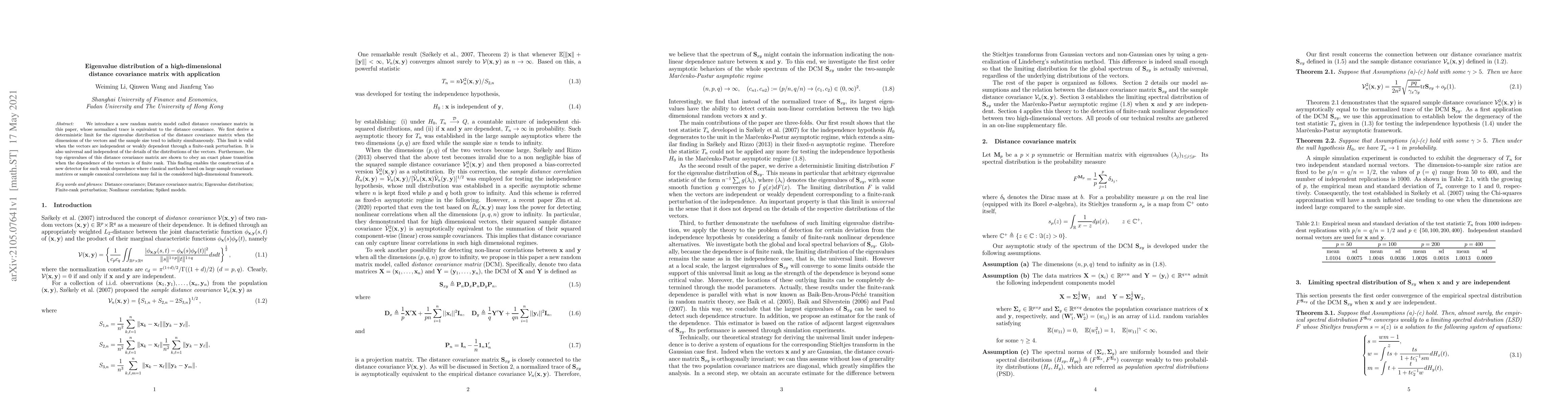 A new random matrix model is introduced to analyze high-dimensional distance covariance, with a universal eigenvalue distribution that holds for independent or weakly dependent vectors. The top eigenvalues exhibit an exact phase transition under finite-rank dependence.