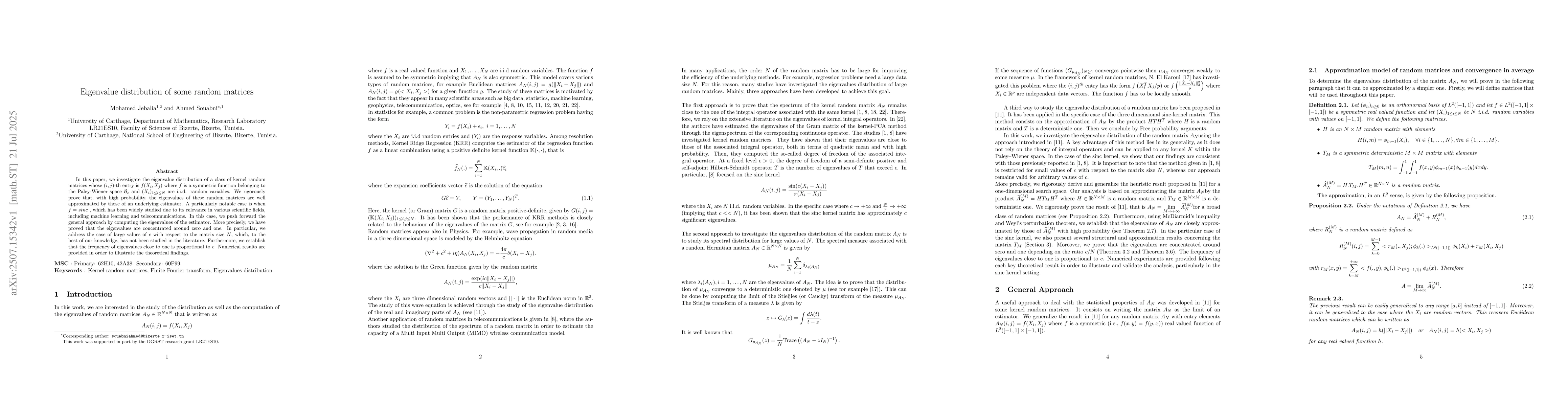 The research investigates the eigenvalue distribution of kernel random matrices with entries $f(X_i, X_j)$, where $f$ is a symmetric function in the Paley-Wiener space $\mathcal{B}_c$ and $(X_i)_{1\leq i \leq N}$ are i.i.d. random variables. The study rigorously proves that, with high probability, the eigenvalues of these random matrices are well approximated by those of an underlying estimator.