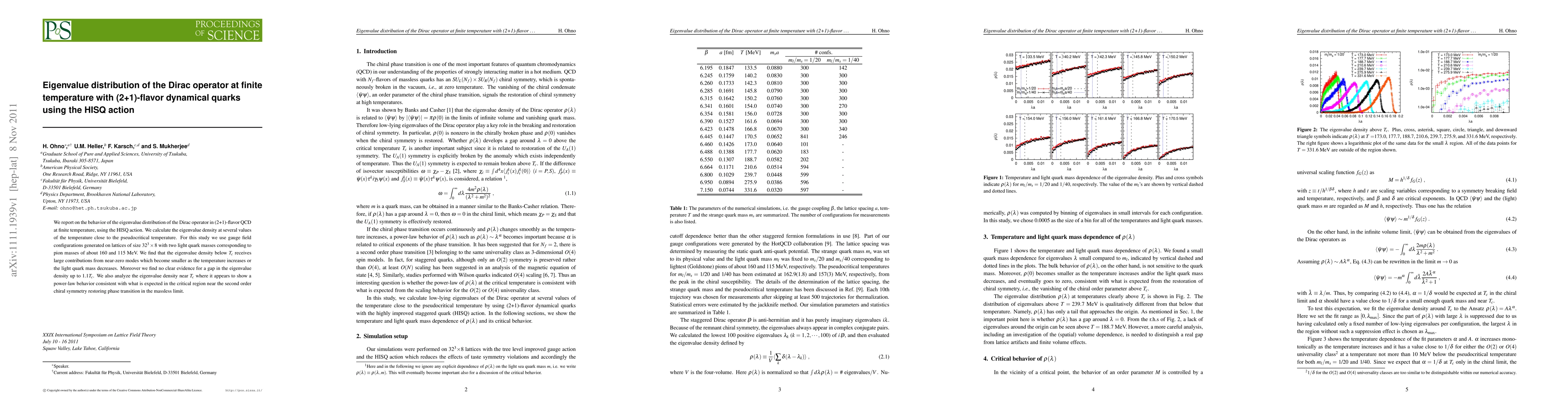 We report on the behavior of the eigenvalue distribution of the Dirac operator in (2+1)-flavor QCD at finite temperature, using the HISQ action. We calculate the eigenvalue density at several values of the temperature close to the pseudocritical temperature. For this study we use gauge field configurations generated on lattices of size $32^3 \times 8$ with two light quark masses corresponding to pion masses of about 160 and 115 MeV. We find that the eigenvalue density below $T_c$ receives large contributions from near-zero modes which become smaller as the temperature increases or the light quark mass decreases. Moreover we find no clear evidence for a gap in the eigenvalue density up to 1.1$T_c$. We also analyze the eigenvalue density near $T_c$ where it appears to show a power-law behavior consistent with what is expected in the critical region near the second order chiral symmetry restoring phase transition in the massless limit.
