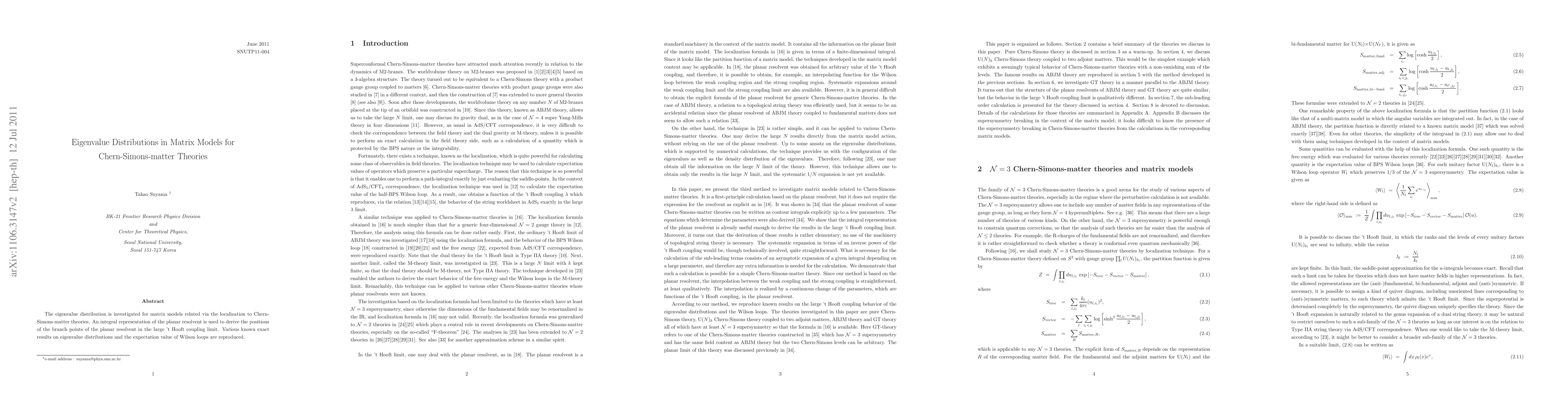 This paper examines the eigenvalue distributions in matrix models linked to Chern-Simons-matter theories, deriving integral representations and the positions of branch points in the large 't Hooft coupling limit. It confirms several established results on eigenvalue distributions and Wilson loop expectations.