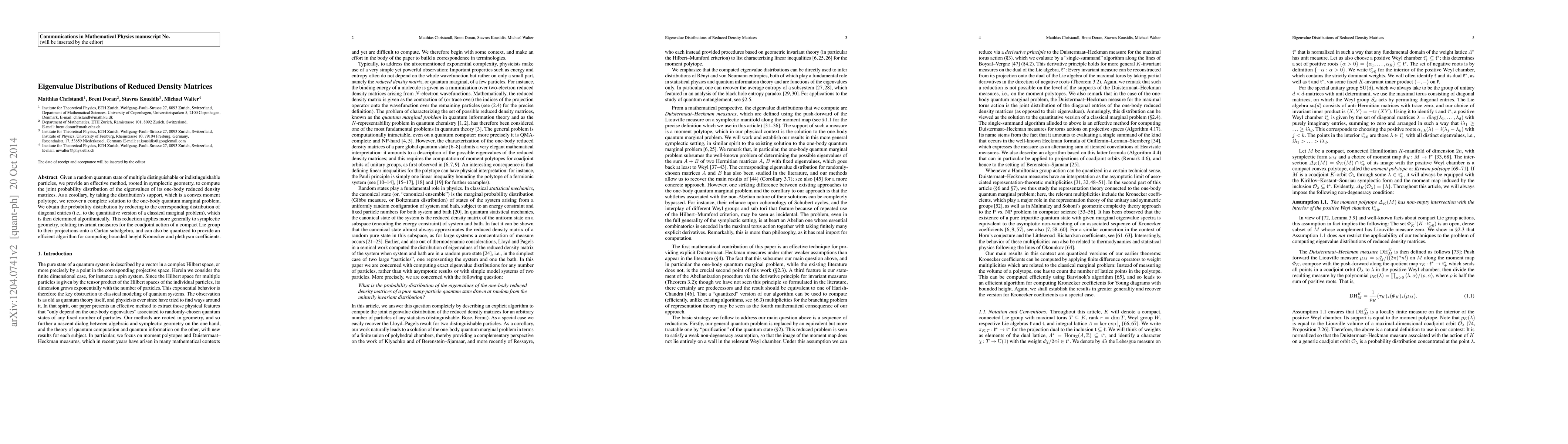 This paper presents a method using symplectic geometry to determine the joint probability distribution of eigenvalues in one-body reduced density matrices of random quantum states. It also solves the one-body quantum marginal problem via the convex moment polytope support of the distribution, and extends the approach to compute Kronecker and plethysm coefficients efficiently.