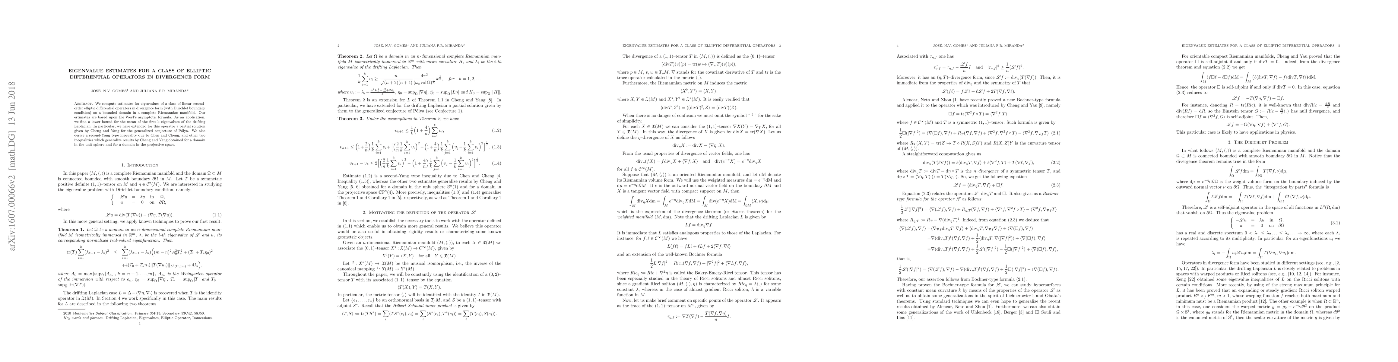 We compute estimates for eigenvalues of a class of linear second-order elliptic differential operators in divergence form (with Dirichlet boundary condition) on a bounded domain in a complete Riemannian manifold. Our estimates are based upon the Weyl's asymptotic formula. As an application, we find a lower bound for the mean of the first k eigenvalues of the drifting Laplacian. In particular, we have extended for this operator a partial solution given by Cheng and Yang for the generalized conjecture of P\'olya. We also derive a second-Yang type inequality due to Chen and Cheng, and other two inequalities which generalize results by Cheng and Yang obtained for a domain in the unit sphere and for a domain in the projective space.