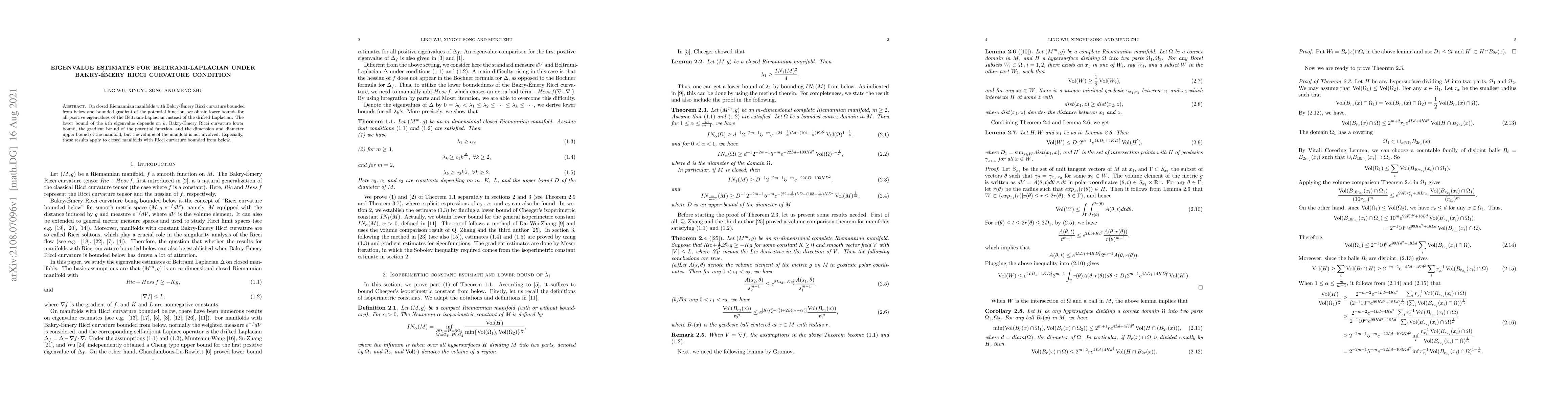 This research establishes lower bounds for the positive eigenvalues of the Beltrami-Laplacian on closed Riemannian manifolds with bounded Bakry-Emery Ricci curvature and bounded gradient potential. The eigenvalue bounds depend on the manifold's dimension and diameter, Ricci curvature, and potential gradient, but not on its volume.