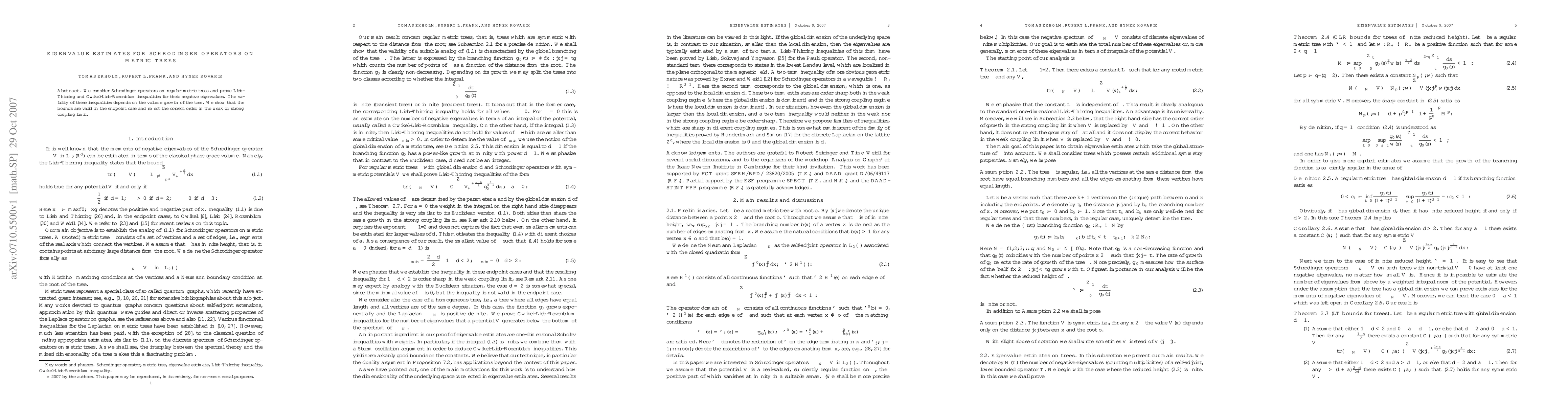 This paper proves Lieb-Thirring and Cwikel-Lieb-Rozenblum inequalities for Schrödinger operators on regular metric trees, demonstrating that the inequalities' validity hinges on the tree's volume growth and accurately reflect the bounds in the strong or weak coupling limits.