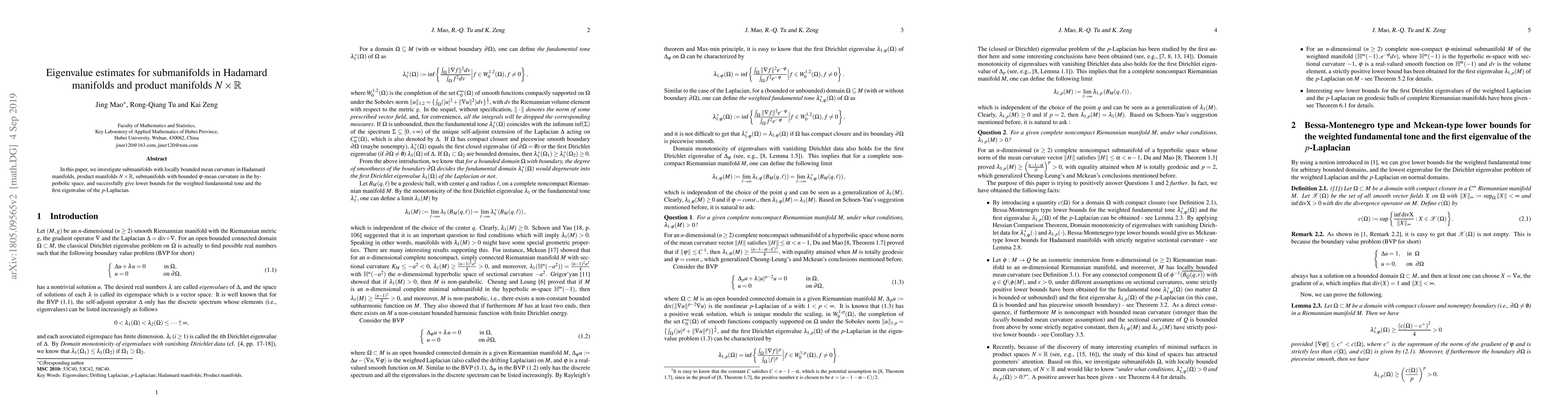In this paper, we investigate submanifolds with locally bounded mean curvature in Hadamard manifolds, product manifolds $N\times\mathbb{R}$, submanifolds with bounded $\varphi$-mean curvature in the hyperbolic space, and successfully give lower bounds for the weighted fundamental tone and the first eigenvalue of the $p$-Laplacian.