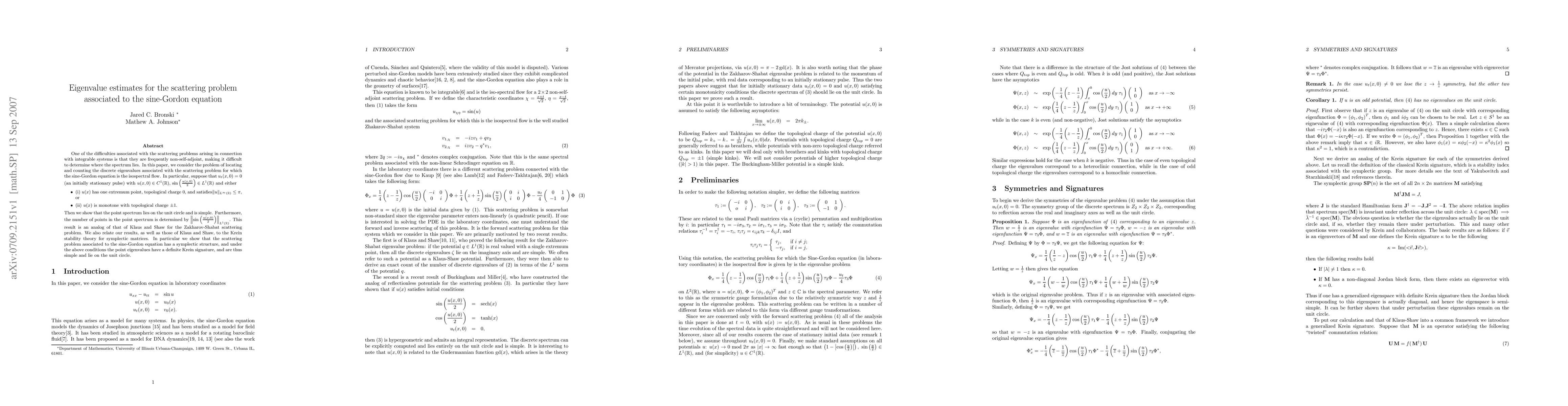 This paper determines the discrete eigenvalues of the scattering problem associated with the sine-Gordon equation, showing that they lie on the unit circle and are simple. It also counts these eigenvalues and connects the results to Krein stability theory for symplectic matrices.