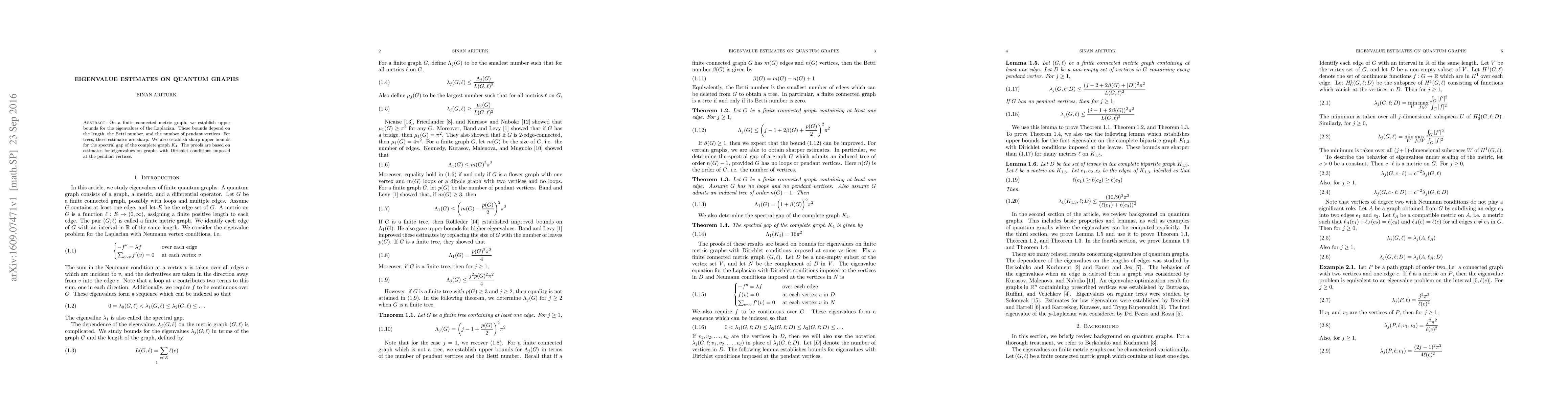 Researchers established upper bounds for eigenvalues of the Laplacian on quantum graphs based on graph length, Betti number, and pendant vertices, with sharp estimates for trees and K4 complete graph.