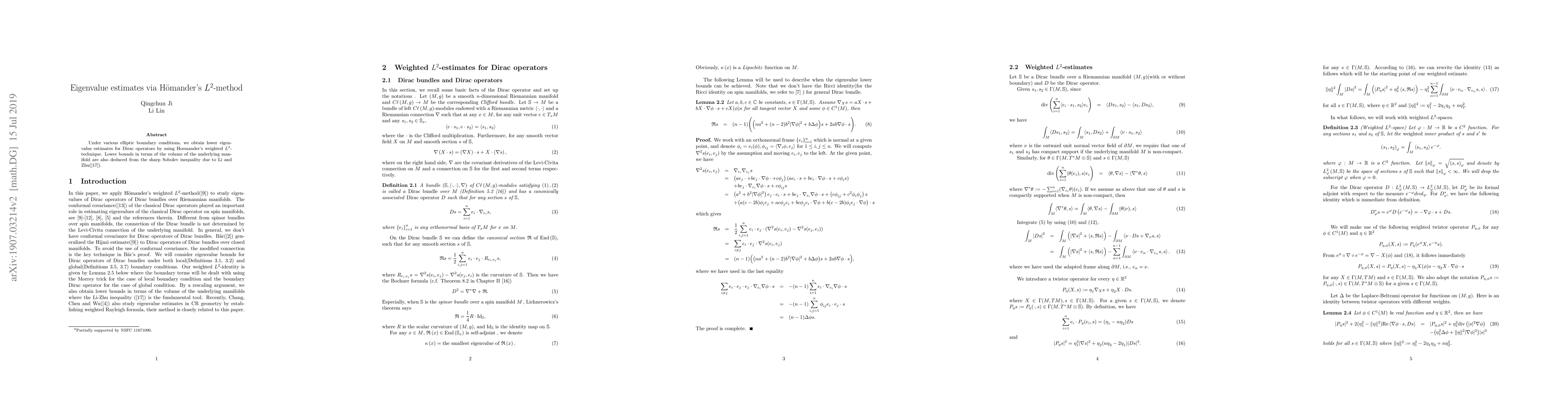 Under various elliptic boundary conditions, we obtain lower eigenvalue estimates for Dirac operators by using Hormander's weighted $L^2$-technique. Lower bounds in terms of the volume of the underlying manifolds are also deduced from the sharp Sobolev inequality due to Li and Zhu(\cite{LZ}).