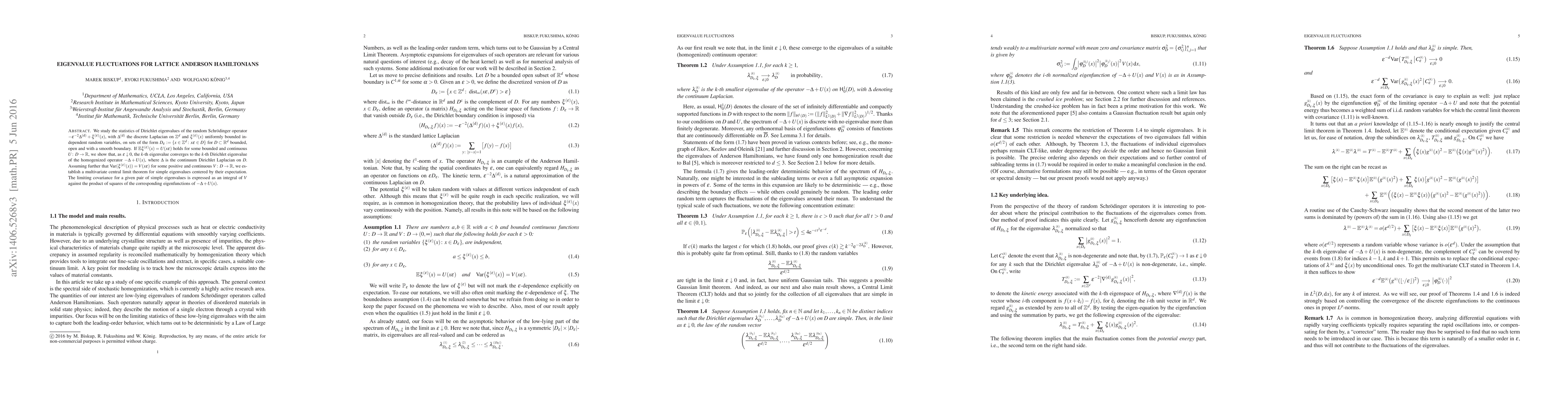 We study the statistics of Dirichlet eigenvalues of the random Schr\"odinger operator $-\epsilon^{-2}\Delta^{(\text{d})}+\xi^{(\epsilon)}(x)$, with $\Delta^{(\text{d})}$ the discrete Laplacian on $\mathbb Z^d$ and $\xi^{(\epsilon)}(x)$ uniformly bounded independent random variables, on sets of the form $D_\epsilon:=\{x\in \mathbb Z^d\colon x\epsilon\in D\}$ for $D\subset \mathbb R^d$ bounded, open and with a smooth boundary. If $\mathbb E\xi^{(\epsilon)}(x)=U(x\epsilon)$ holds for some bounded and continuous $U\colon D\to \mathbb R$, we show that, as $\epsilon\downarrow0$, the $k$-th eigenvalue converges to the $k$-th Dirichlet eigenvalue of the homogenized operator $-\Delta+U(x)$, where $\Delta$ is the continuum Dirichlet Laplacian on $D$. Assuming further that $\text{Var}(\xi^{(\epsilon)}(x))=V(x\epsilon)$ for some positive and continuous $V\colon D\to \mathbb R$, we establish a multivariate central limit theorem for simple eigenvalues centered by their expectation. The limiting covariance for a given pair of simple eigenvalues is expressed as an integral of $V$ against the product of squares of the corresponding eigenfunctions of $-\Delta+U(x)$.