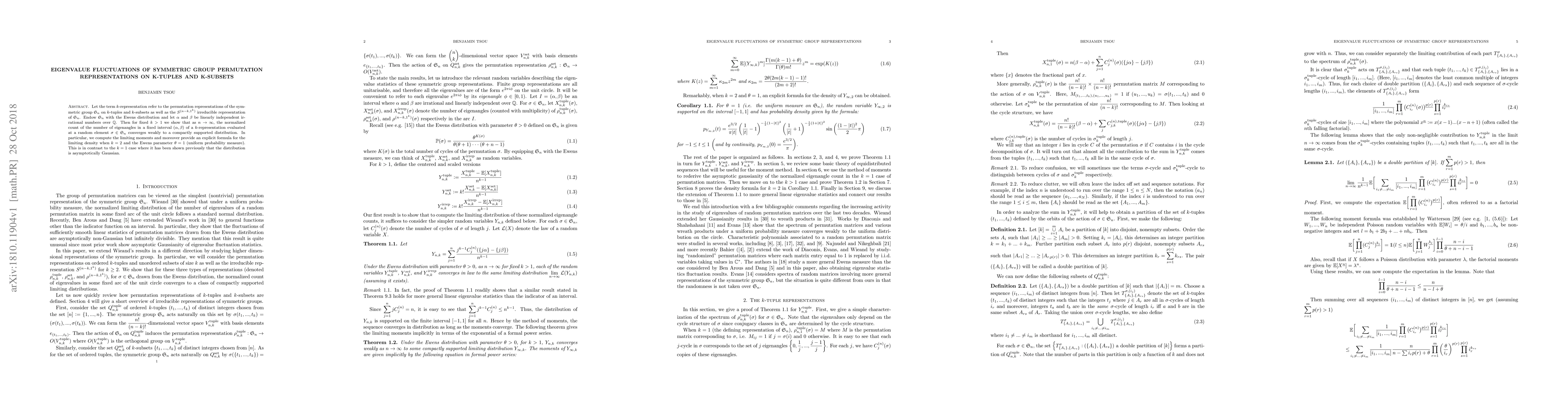 This paper investigates the eigenvalue fluctuations of permutation representations of the symmetric group on $k$-tuples and $k$-subsets under the Ewens distribution. It demonstrates that, as $n$ grows, the normalized count of eigenangles in a fixed interval converges weakly to a compactly supported distribution, with explicit formulas provided for $k=2$ and $\theta=1$.