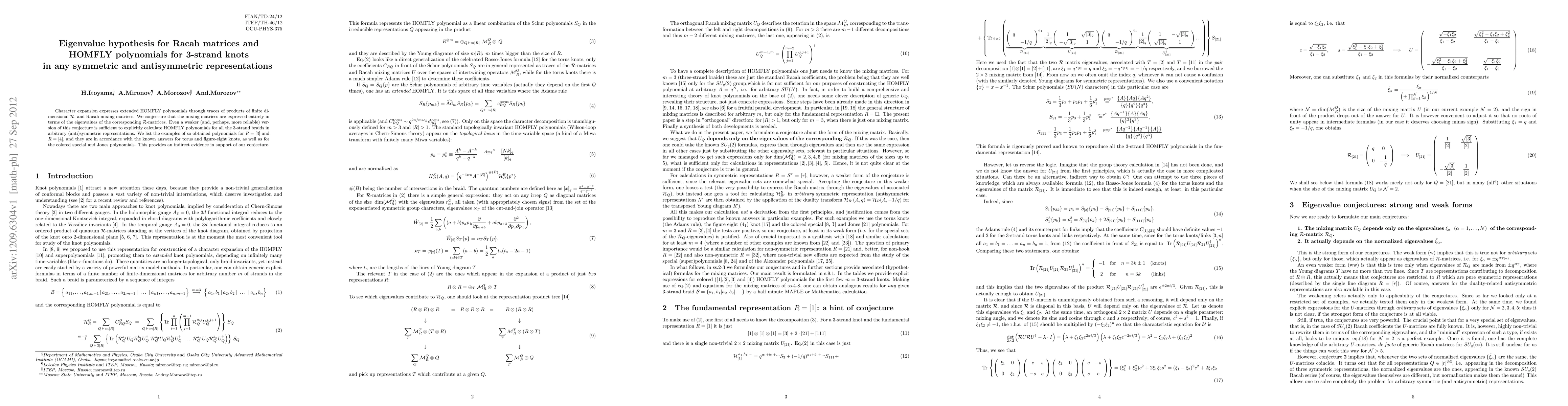This paper proposes a conjecture linking the eigenvalues of R-matrices to Racah matrices, suggesting that extended HOMFLY polynomials for 3-strand knots can be calculated using these eigenvalues. The conjecture is supported by calculated HOMFLY polynomials for specific cases, aligning with known results for various knots.