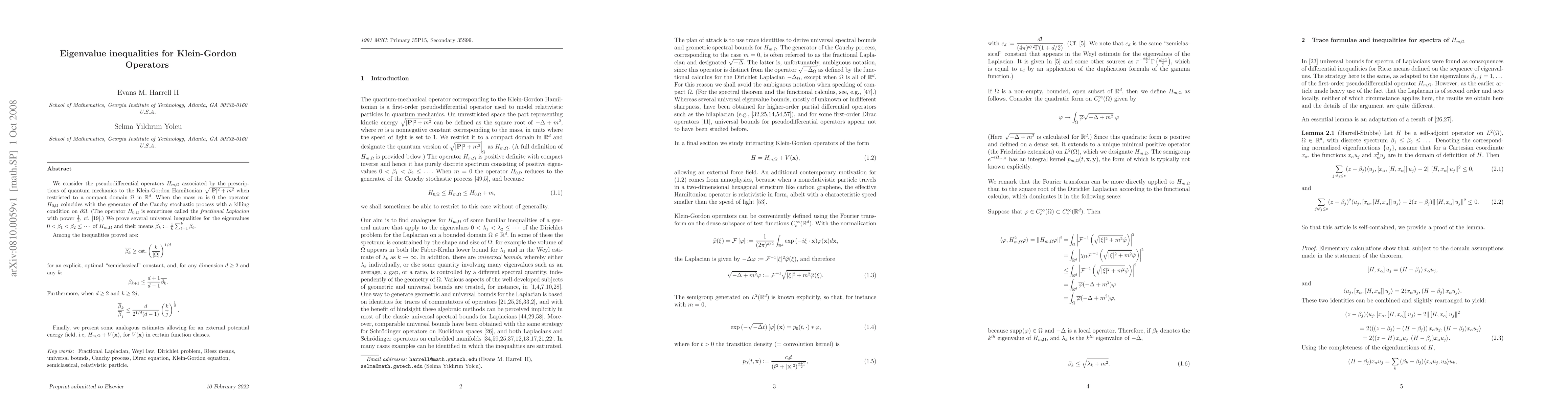 We consider the pseudodifferential operators $H_{m,\Omega}$ associated by the prescriptions of quantum mechanics to the Klein-Gordon Hamiltonian $\sqrt{|{\bf P}|^2+m^2}$ when restricted to a compact domain $\Omega$ in ${\mathbb R}^d$. When the mass $m$ is 0 the operator $H_{0,\Omega}$ coincides with the generator of the Cauchy stochastic process with a killing condition on $\partial \Omega$. (The operator $H_{0,\Omega}$ is sometimes called the {\it fractional Laplacian} with power 1/2, cf. \cite{Gie}.) We prove several universal inequalities for the eigenvalues $0 < \beta_1 < \beta_2 \le >...$ of $H_{m,\Omega}$ and their means $\overline{\beta_k} := \frac{1}{k} \sum_{\ell=1}^k{\beta_\ell}$. Among the inequalities proved are: {\overline{\beta_k}} \ge {\rm cst.} (\frac{k}{|\Omega|})^{1/d} for an explicit, optimal "semiclassical" constant, and, for any dimension $d \ge 2$ and any $k$: \beta_{k+1} \le \frac{d+1}{d-1} \overline{\beta_k}. Furthermore, when $d \ge 2$ and $k \ge 2j$, \frac{\overline{\beta}_{k}}{\overline{\beta}_{j}} \leq \frac{d}{2^{1/d}(d-1)}(\frac{k}{j})^{\frac{1}{d}}. Finally, we present some analogous estimates allowing for an external potential energy field, i.e, $H_{m,\Omega}+ V(\bf x)$, for $V(\bf x)$ in certain function classes.