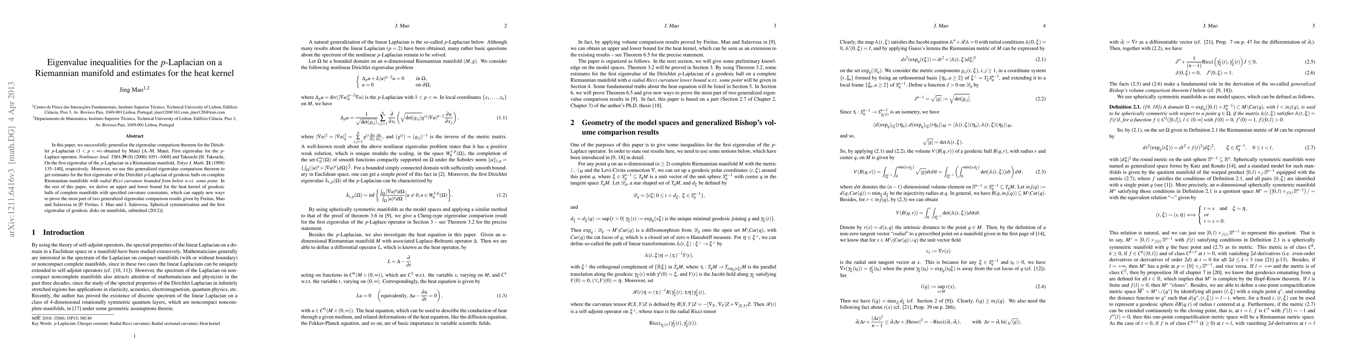 This paper generalizes eigenvalue comparison theorems for the Dirichlet $p$-Laplacian on Riemannian manifolds and uses these to derive estimates for the first eigenvalue of geodesic balls under Ricci curvature bounds. It also provides upper and lower bounds for the heat kernel in geodesic balls, offering new methods to support generalized eigenvalue comparison results.