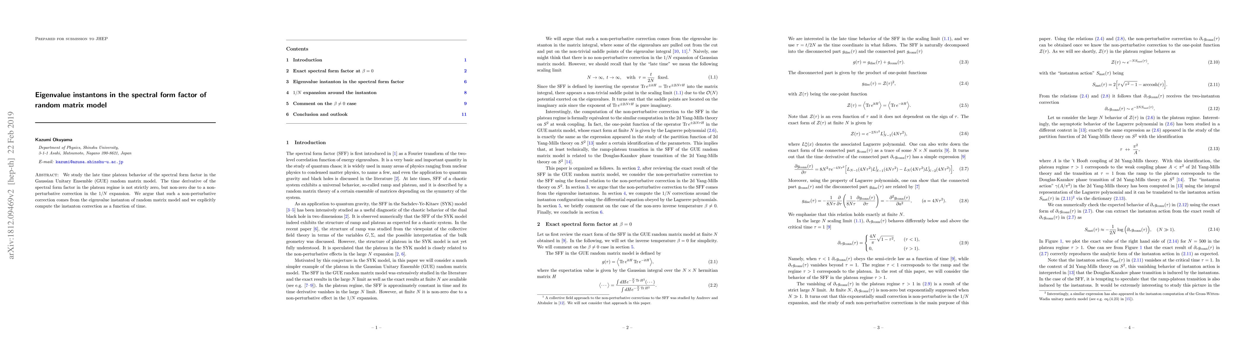 This paper investigates the late-time plateau behavior of the spectral form factor in the GUE random matrix model, revealing a non-zero time derivative due to a non-perturbative $1/N$ correction. The authors attribute this correction to eigenvalue instantons and compute the instanton contribution explicitly as a function of time.