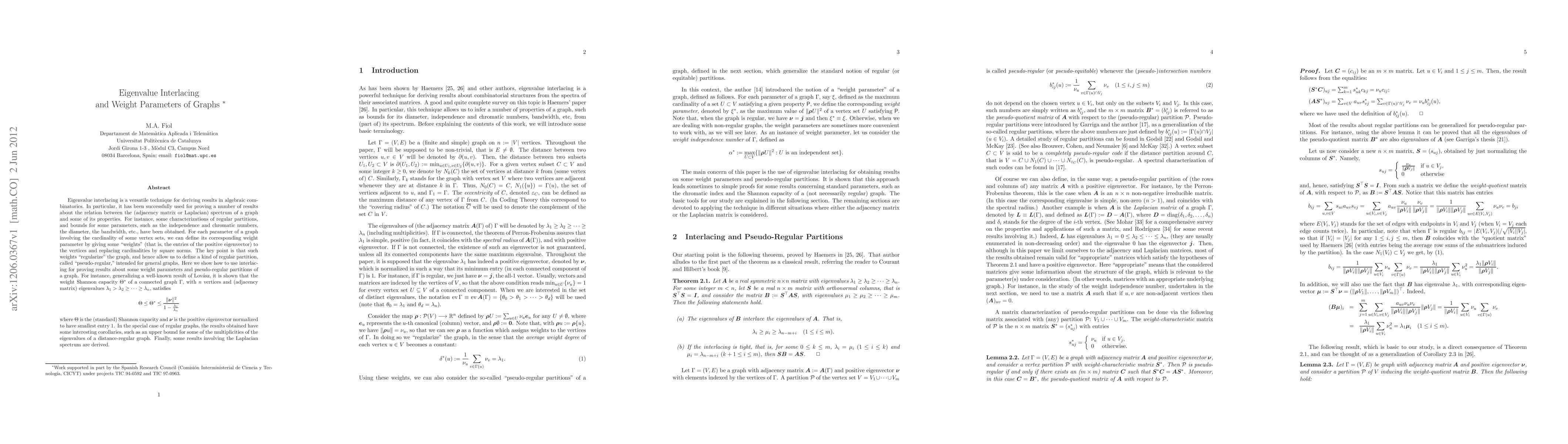 Eigenvalue interlacing is a versatile technique for deriving results in algebraic combinatorics. In particular, it has been successfully used for proving a number of results about the relation between the (adjacency matrix or Laplacian) spectrum of a graph and some of its properties. For instance, some characterizations of regular partitions, and bounds for some parameters, such as the independence and chromatic numbers, the diameter, the bandwidth, etc., have been obtained. For each parameter of a graph involving the cardinality of some vertex sets, we can define its corresponding weight parameter by giving some "weights" (that is, the entries of the positive eigenvector) to the vertices and replacing cardinalities by square norms. The key point is that such weights "regularize" the graph, and hence allow us to define a kind of regular partition, called "pseudo-regular," intended for general graphs. Here we show how to use interlacing for proving results about some weight parameters and pseudo-regular partitions of a graph. For instance, generalizing a well-known result of Lov\'asz, it is shown that the weight Shannon capacity $\Theta^*$ of a connected graph $\G$, with $n$ vertices and (adjacency matrix) eigenvalues $\lambda_1>\lambda_2\ge\...\ge \lambda_n$, satisfies $$ \Theta\le \Theta^* \le \frac{\|\vecnu\|^2}{1-\frac{\lambda_1}{\lambda_n}} $$ where $\Theta$ is the (standard) Shannon capacity and $\vecnu$ is the positive eigenvector normalized to have smallest entry 1. In the special case of regular graphs, the results obtained have some interesting corollaries, such as an upper bound for some of the multiplicities of the eigenvalues of a distance-regular graph. Finally, some results involving the Laplacian spectrum are derived. spectrum are derived.