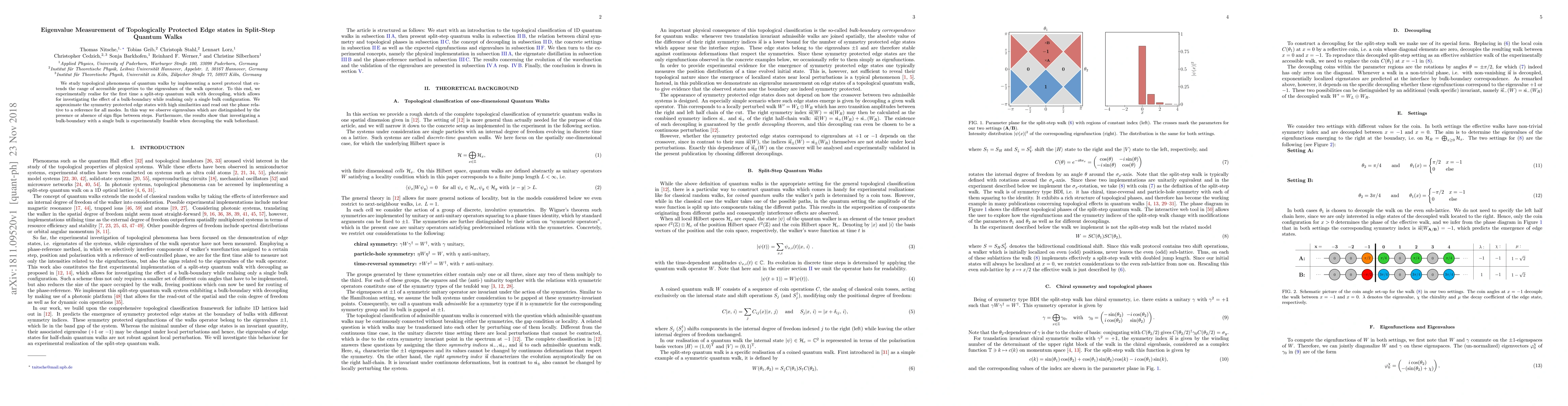 This paper presents a novel protocol for measuring eigenvalues in topologically protected edge states of split-step quantum walks, demonstrating experimentally feasible investigation of bulk-boundary effects using a single bulk configuration and observing distinct eigenvalues with sign flips.
