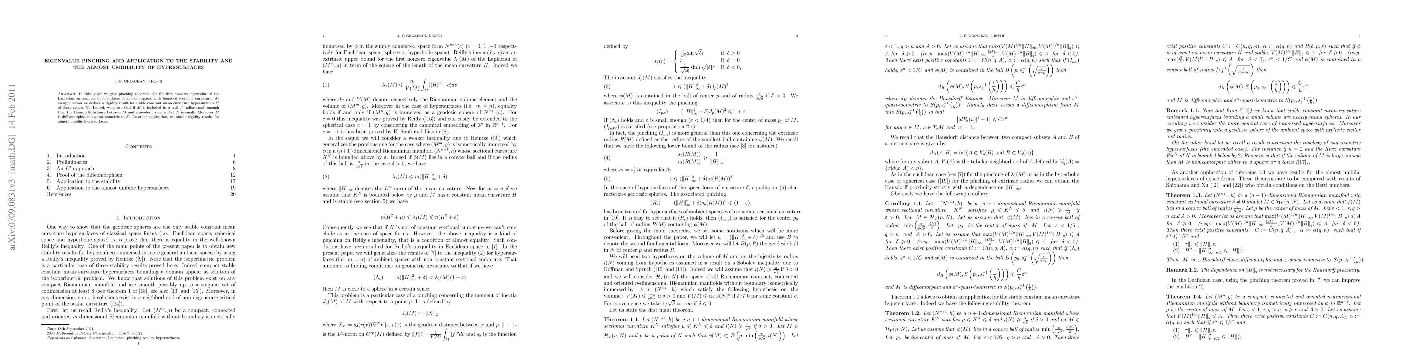 In this paper we give pinching theorems for the first nonzero eigenvalue of the Laplacian on the compact hypersurfaces of ambient spaces with bounded sectional curvature. As application we deduce rigidity results for stable constant mean curvature hypersurfaces $M$ of these spaces $N$. Indeed, we prove that if $M$ is included in a ball of radius small enough then the Hausdorff-distance between $M$ and a geodesic sphere $S$ of $N$ is small. Moreover $M$ is diffeomorphic and quasi-isometric to $S$. As other application, we give rigidity results for almost umbilic hypersurfaces.