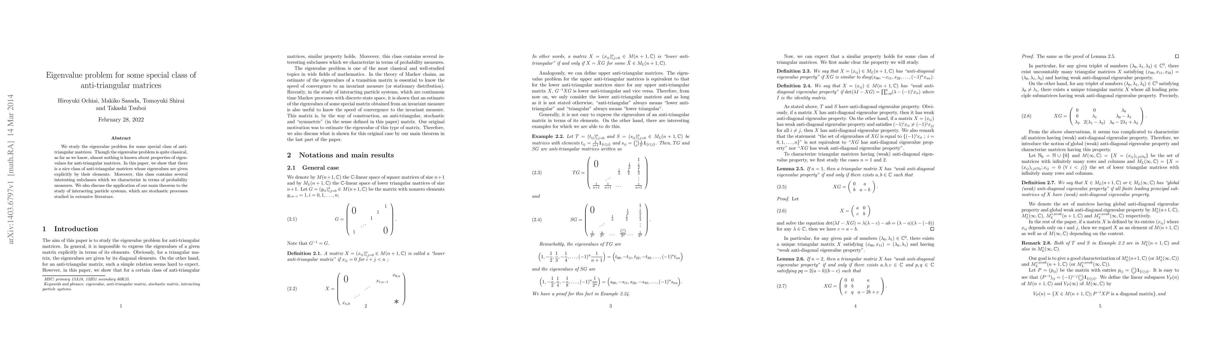 We study the eigenvalue problem for some special class of anti-triangular matrices. Though the eigenvalue problem is quite classical, as far as we know, almost nothing is known about properties of eigenvalues for anti-triangular matrices. In this paper, we show that there is a nice class of anti-triangular matrices whose eigenvalues are given explicitly by their elements. Moreover, this class contains several interesting subclasses which we characterize in terms of probability measures. We also discuss the application of our main theorem to the study of interacting particle systems, which are stochastic processes studied in extensive literature.