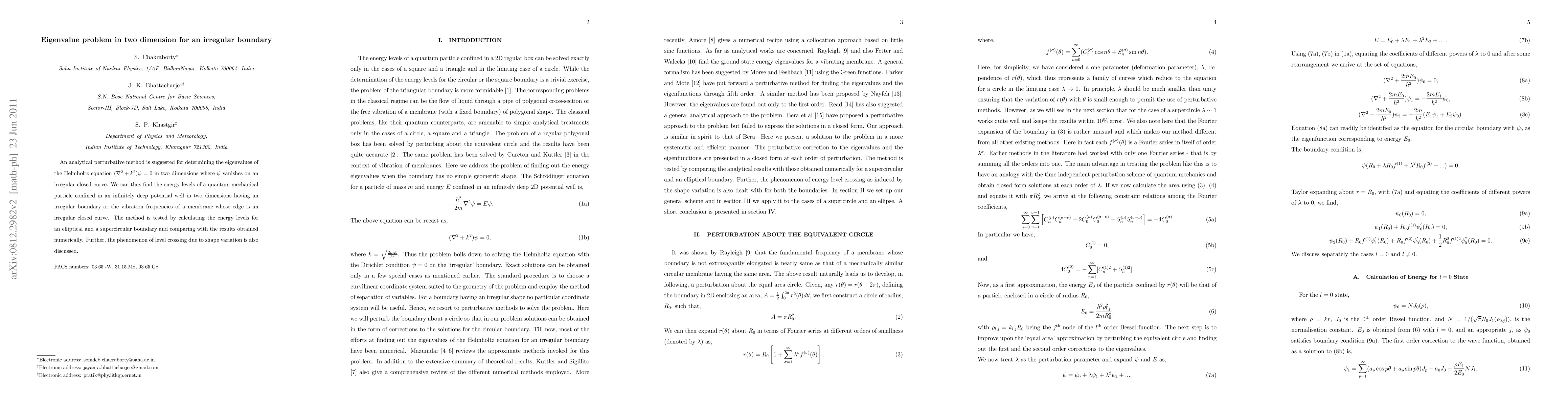 An analytical perturbative method is suggested for solving the Helmholtz equation (\bigtriangledown^{2} + k^{2}){\psi} = 0 in two dimensions where {\psi} vanishes on an irregular closed curve. We can thus find the energy levels of a quantum mechanical particle confined in an infinitely deep potential well in two dimensions having an irregular boundary or the vibration frequencies of a membrane whose edge is an irregular closed curve. The method is tested by calculating the energy levels for an elliptical and a supercircular boundary and comparing with the results obtained numerically. Further, the phenomenon of level crossing due to shape variation is also discussed.