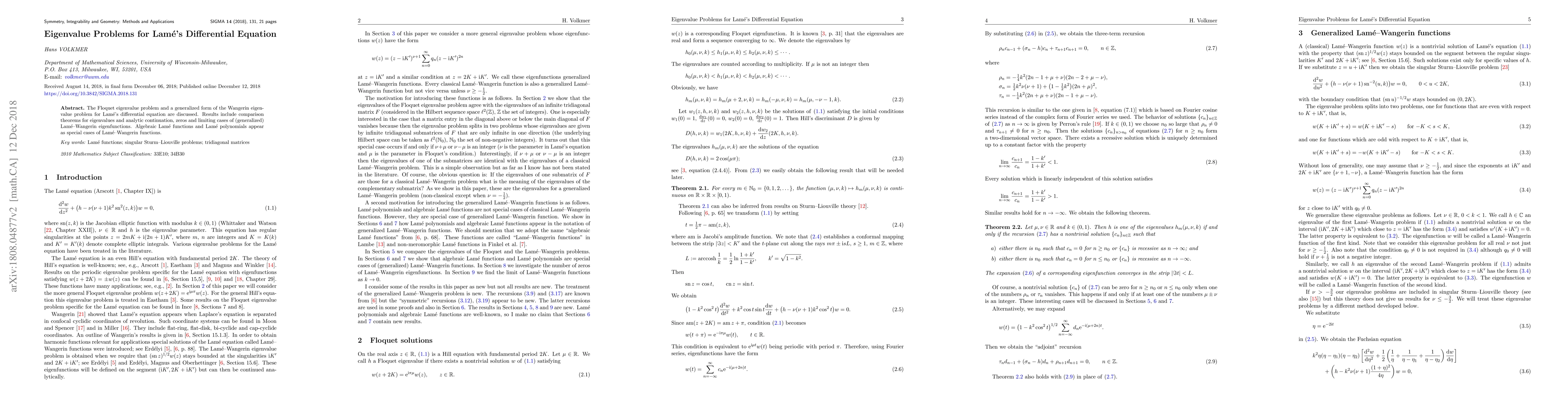 This paper explores the Floquet and generalized Wangerin eigenvalue problems for Lam\'e's differential equation, presenting comparison theorems for eigenvalues and analyzing the analytic continuation, zeros, and limiting cases of associated eigenfunctions. Special cases include algebraic Lam\'e functions and Lam\'e polynomials.