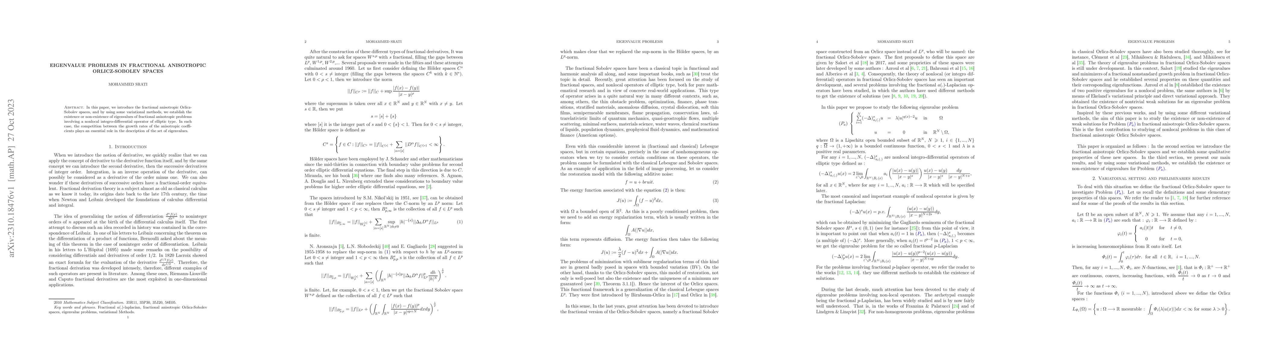This paper introduces fractional anisotropic Orlicz-Sobolev spaces and uses variational methods to explore the existence or non-existence of eigenvalues for fractional anisotropic problems involving a nonlocal elliptic operator, highlighting the impact of anisotropic coefficient growth rates on the eigenvalue set.
