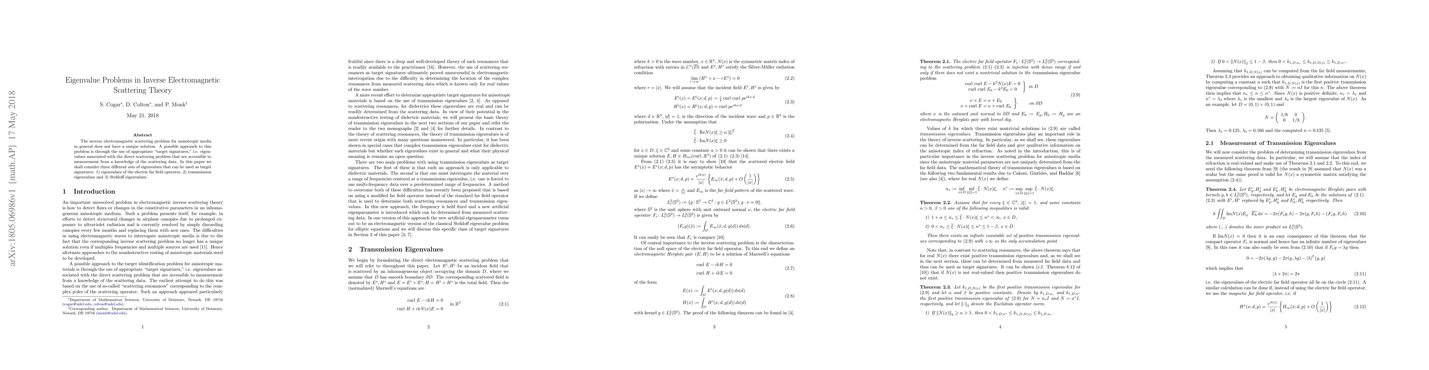 The inverse electromagnetic scattering problem for anisotropic media in general does not have a unique solution. A possible approach to this problem is through the use of appropriate "target signatures," i.e. eigenvalues associated with the direct scattering problem that are accessible to measurement from a knowledge of the scattering data. In this paper we shall consider three different sets of eigenvalues that can be used as target signatures: 1) eigenvalues of the electric far field operator, 2) transmission eigenvalues and 3) Stekloff eigenvalues.