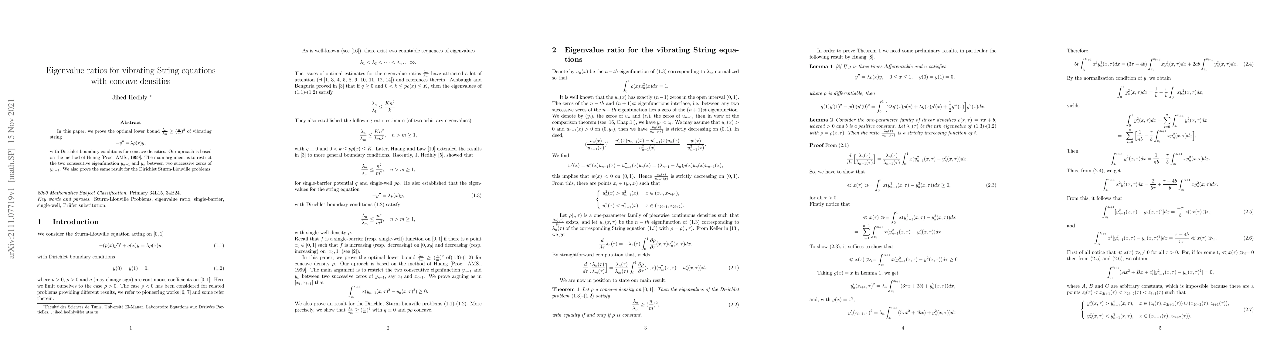 In this paper, we prove the optimal lower bound $\frac{\lambda_n}{\lambda_m}\geq(\frac{n}{m})^2$ of vibrating string $$-y''=\lambda\rho(x) y,$$ with Dirichlet boundary conditions for concave densities. Our aproach is based on the method of Huang [Proc. AMS., 1999]. The main argument is to restrict the two consecutive eigenfunction $y_{n-1}$ and $y_n$ between two successive zeros of $y_{n-1}$. We also prove the same result for the Dirichlet Sturm-Liouville problems.