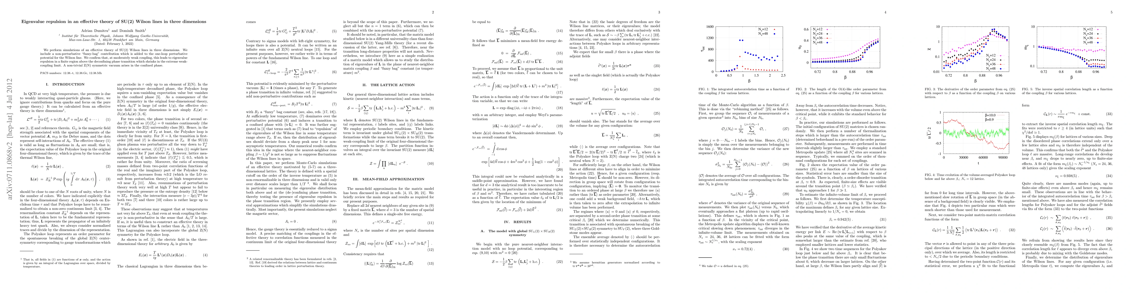Summary: Simulations of an effective theory of SU(2) Wilson lines in three dimensions show eigenvalue repulsion above the deconfining phase transition, with a non-perturbative "fuzzy-bag" contribution enhancing repulsion, which diminishes in the weak-coupling limit, leading to a non-trivial Z(N) symmetric vacuum in the confined phase.