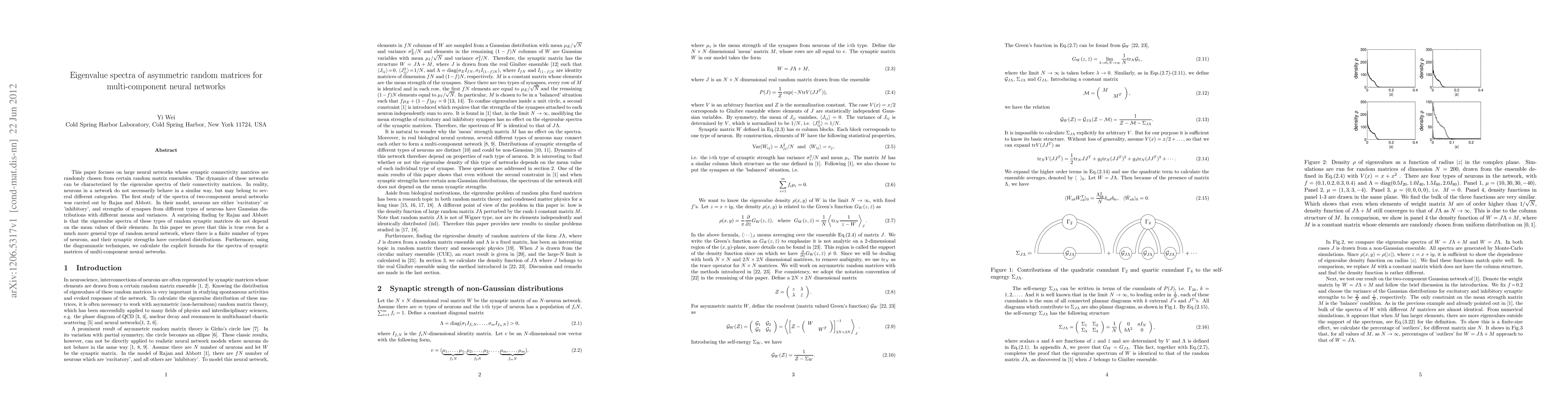 This paper investigates the eigenvalue spectra of asymmetric random matrices in multi-component neural networks, proving that spectra remain invariant regardless of mean synaptic strengths, even with correlated distributions. It also provides an explicit formula for these spectra using diagrammatic techniques.
