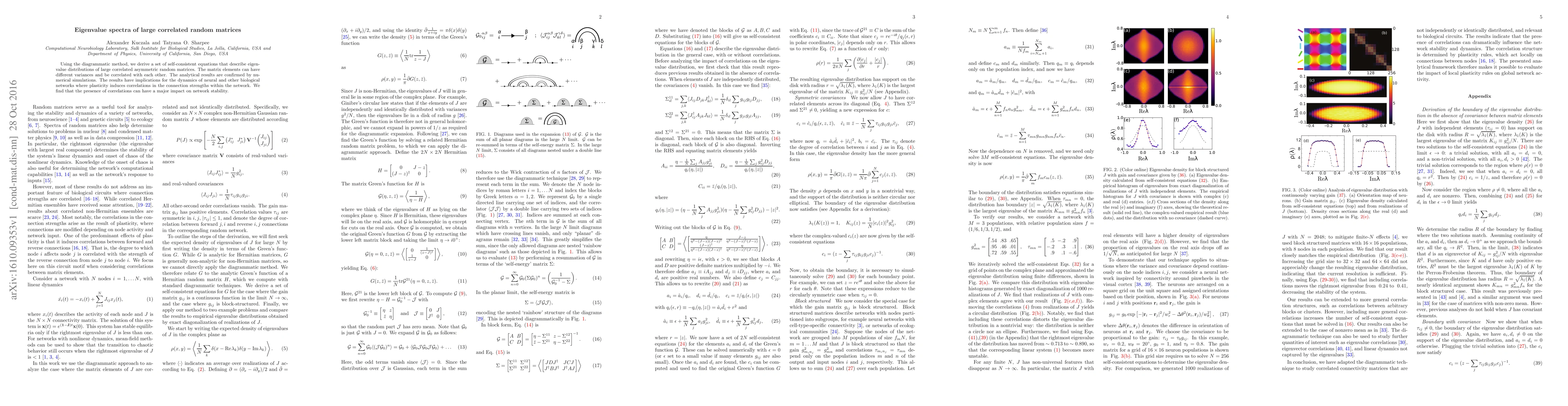 Using the diagrammatic method, we derive a set of self-consistent equations that describe eigenvalue distributions of large correlated asymmetric random matrices. The matrix elements can have different variances and be correlated with each other. The analytical results are confirmed by numerical simulations. The results have implications for the dynamics of neural and other biological networks where plasticity induces correlations in the connection strengths within the network. We find that the presence of correlations can have a major impact on network stability.
