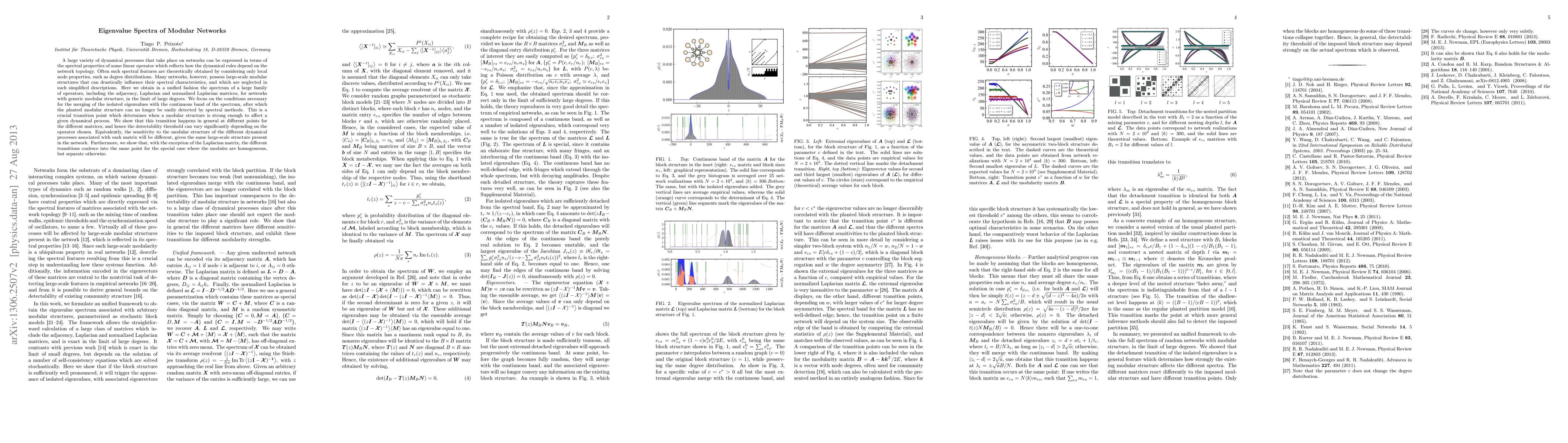 A large variety of dynamical processes that take place on networks can be expressed in terms of the spectral properties of some linear operator which reflects how the dynamical rules depend on the network topology. Often such spectral features are theoretically obtained by considering only local node properties, such as degree distributions. Many networks, however, possess large-scale modular structures that can drastically influence their spectral characteristics, and which are neglected in such simplified descriptions. Here we obtain in a unified fashion the spectrum of a large family of operators, including the adjacency, Laplacian and normalized Laplacian matrices, for networks with generic modular structure, in the limit of large degrees. We focus on the conditions necessary for the merging of the isolated eigenvalues with the continuous band of the spectrum, after which the planted modular structure can no longer be easily detected by spectral methods. This is a crucial transition point which determines when a modular structure is strong enough to affect a given dynamical process. We show that this transition happens in general at different points for the different matrices, and hence the detectability threshold can vary significantly depending on the operator chosen. Equivalently, the sensitivity to the modular structure of the different dynamical processes associated with each matrix will be different, given the same large-scale structure present in the network. Furthermore, we show that, with the exception of the Laplacian matrix, the different transitions coalesce into the same point for the special case where the modules are homogeneous, but separate otherwise.