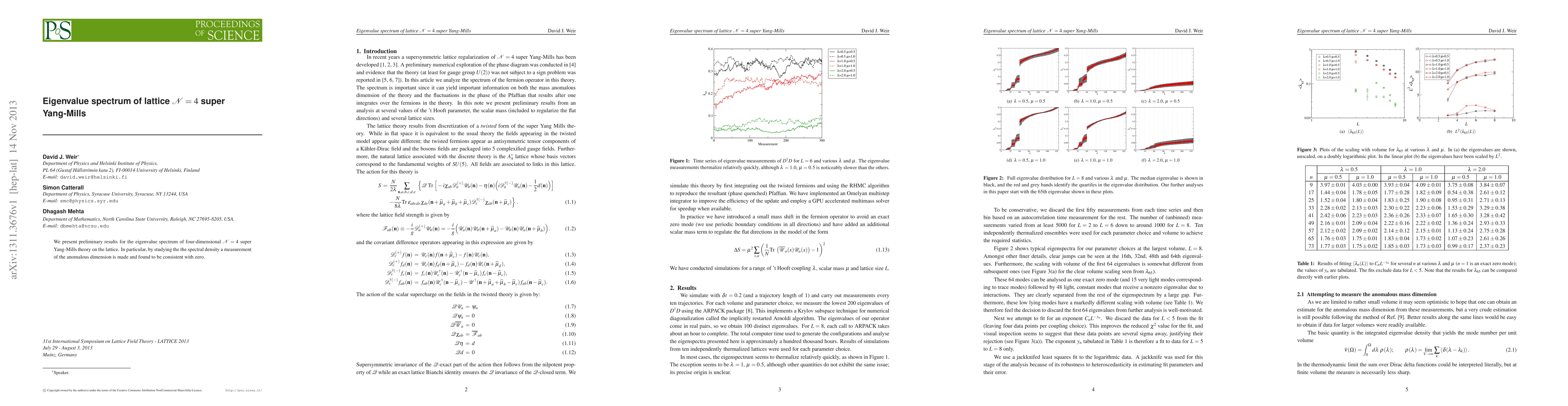 Summary: This paper reports initial findings on the eigenvalue spectrum of lattice ${\cal N}=4$ super Yang-Mills in four dimensions, revealing a spectral density analysis that supports an anomalous dimension measurement close to zero.
