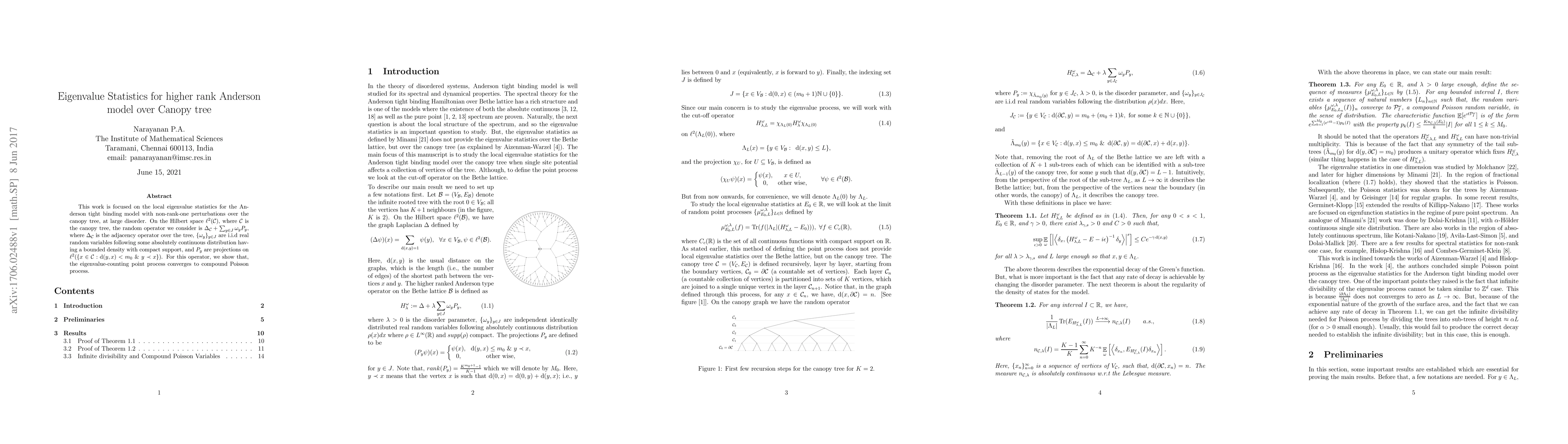 This work is focused on the local eigenvalue statistics for the Anderson tight binding model with non-rank-one perturbations over the canopy tree, at large disorder. On the Hilbert space $\ell^2(\mathcal{C})$, where $ \mathcal{C} $ is the canopy tree, the random operator we consider is $\Delta_{\mathcal{C}}+\sum_{y\in J}\omega_y P_y$, where $\Delta_{\mathcal{C}}$ is the adjacency operator over the tree, $\{\omega_y\}_{y\in J}$ are i.i.d real random variables following some absolutely continuous distribution having a bounded density with compact support, and $P_y$ are projections on $\ell^2(\{x\in\mathcal{C}: dist(y,x)< m_0 \& y\prec x\})$. For this operator, we show that, the eigenvalue-counting point process converges to compound Poisson process.
