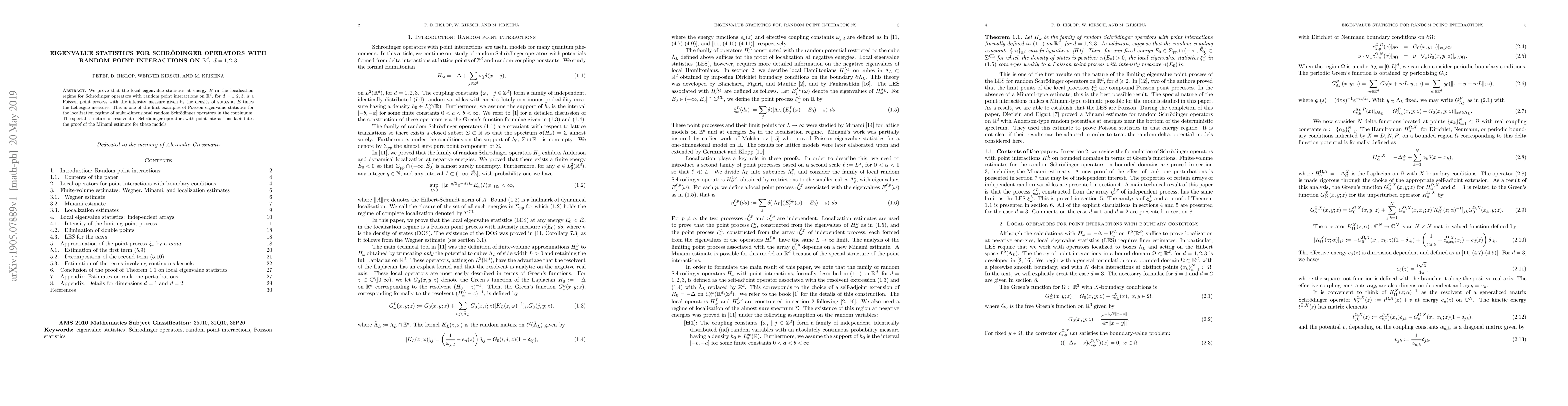 This paper demonstrates that the local eigenvalue statistics for Schrödinger operators with random point interactions in dimensions 1, 2, and 3 exhibit Poisson point process behavior, with intensity proportional to the density of states times the Lebesgue measure. This finding is significant as it provides one of the first examples of Poisson eigenvalue statistics in the localization regime for multi-dimensional random Schrödinger operators.
