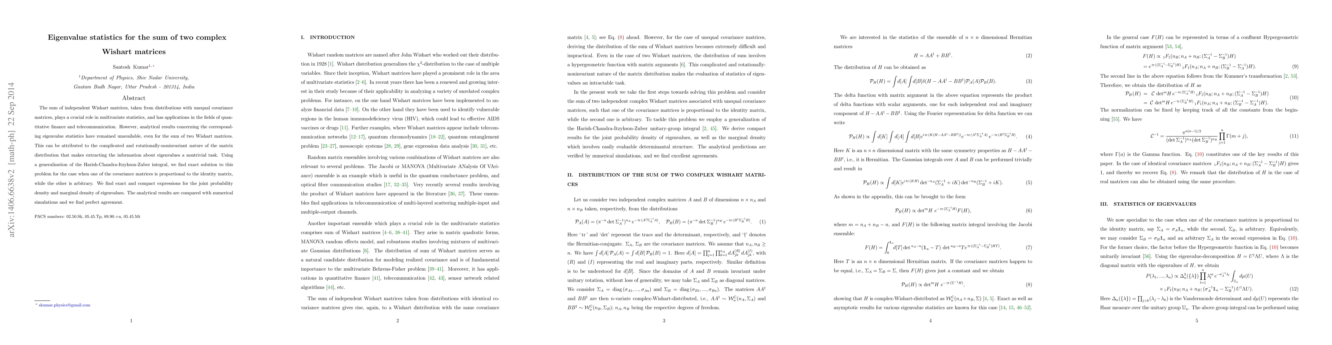 The paper presents an exact analytical solution for the eigenvalue statistics of the sum of two complex Wishart matrices, deriving expressions for joint and marginal eigenvalue densities, and validates the results through numerical simulations.