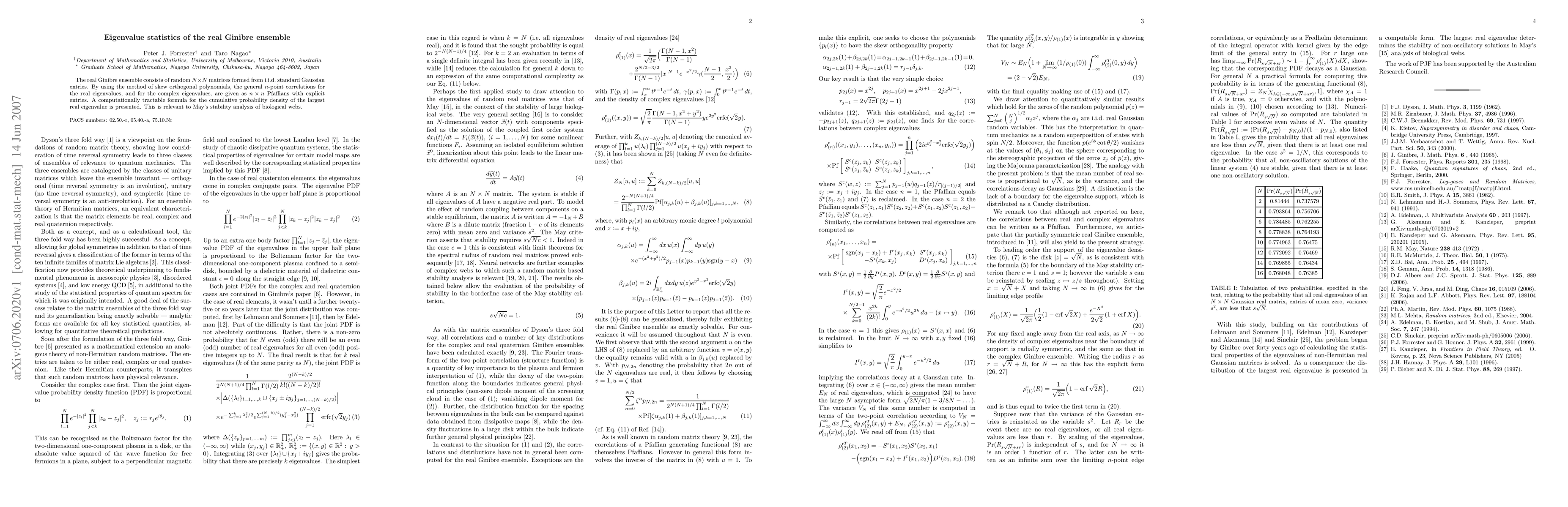 The paper investigates the eigenvalue statistics of the real Ginibre ensemble, deriving $n$-point correlations for real and complex eigenvalues as $n \times n$ Pfaffians. It also provides a formula for the cumulative probability density of the largest real eigenvalue, relevant to stability analysis in biological networks.